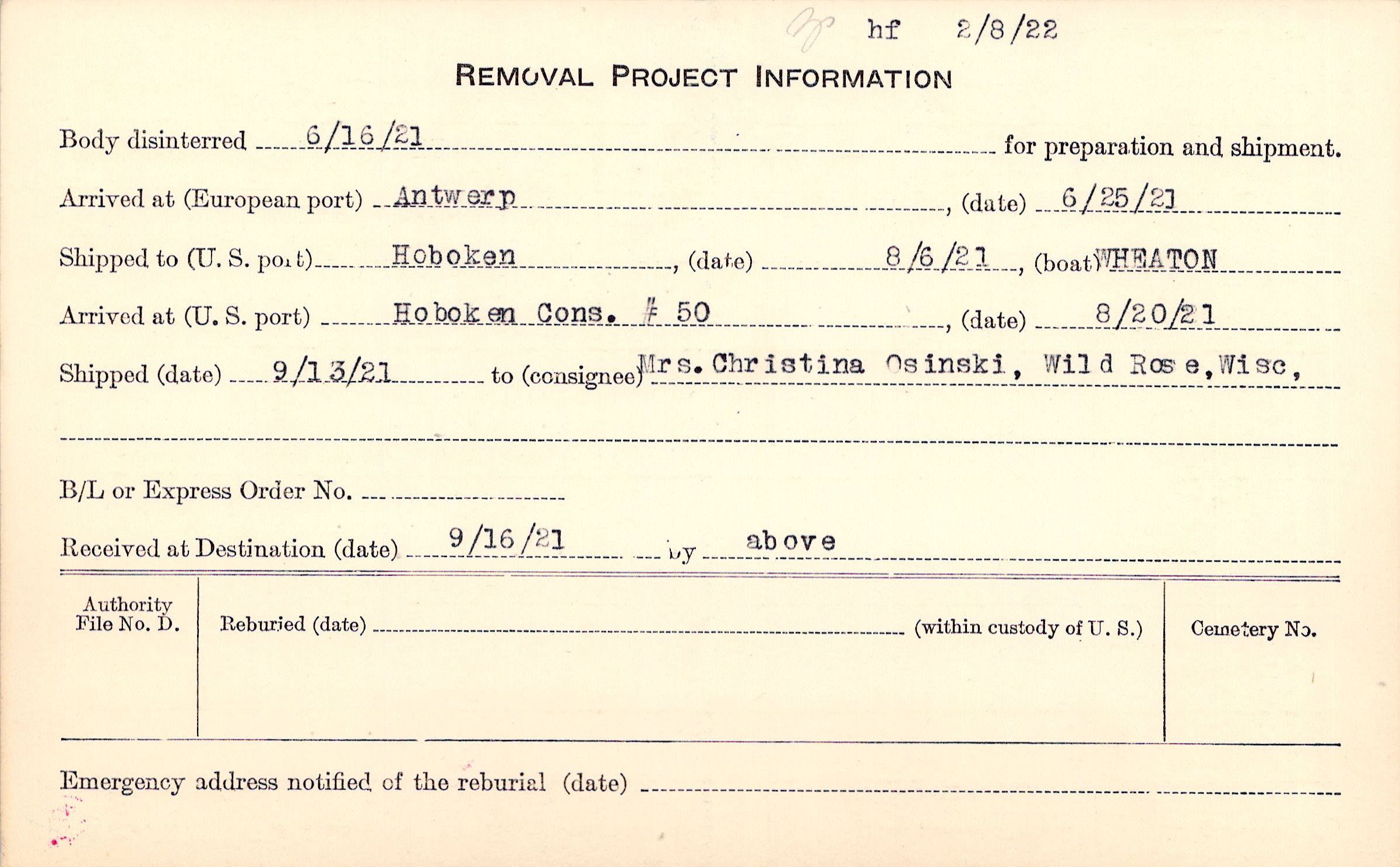 Body disinterred 6/16/1921 for preparation and shipment.