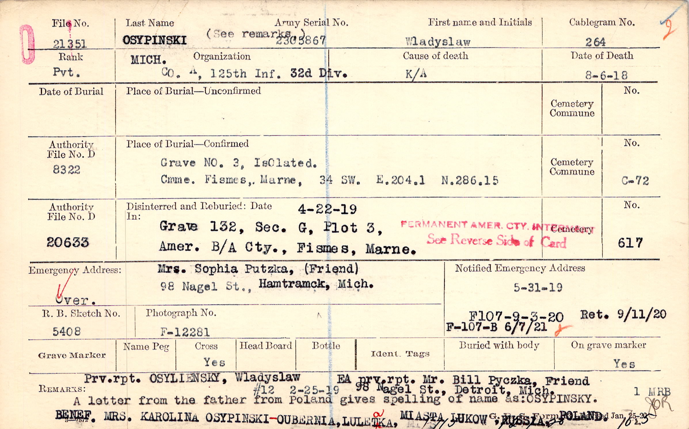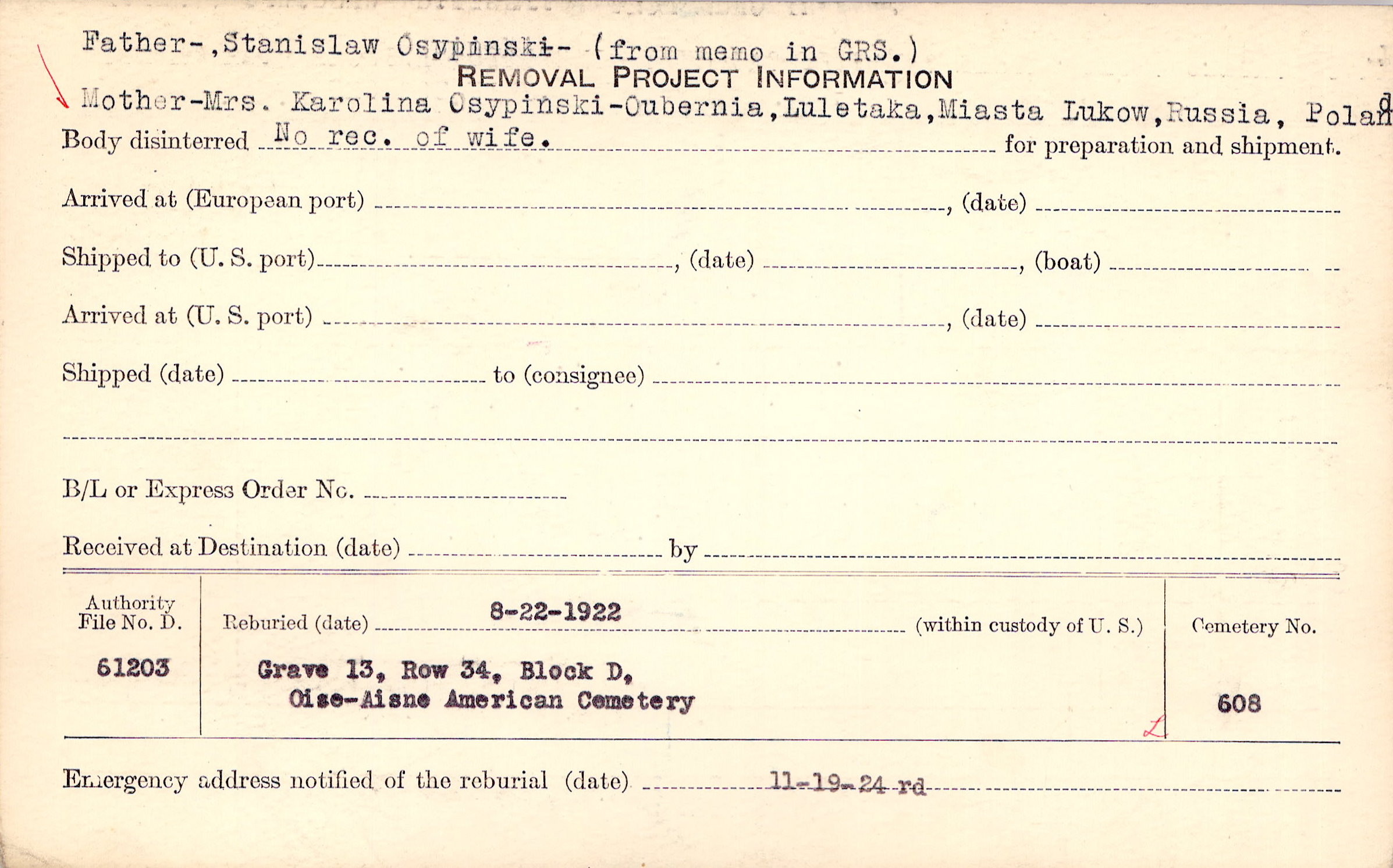 Father -, Stanislaw Osypinski (from memo in GRS.) Mother - Mrs. Karolina Osypinski-Oubernia, Luletaka, Miasta Lukow, Russia, Poland No rec. of wife. |