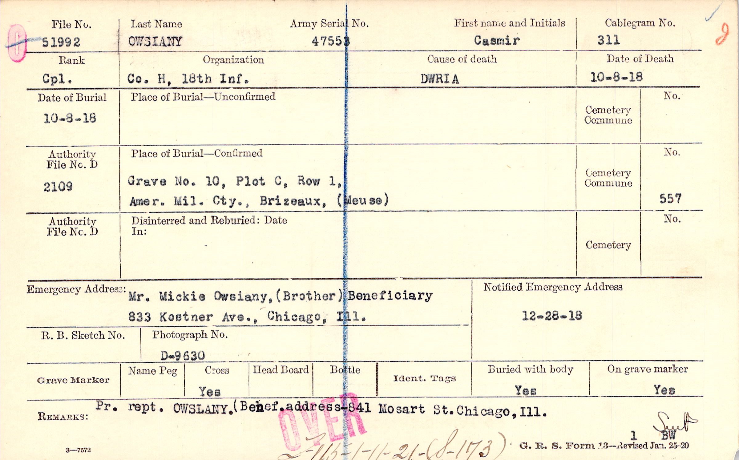 Mr. Mickie Owsiany,(Brother), 833 Kostner Ave., Chicago, Ill., Beneficiary