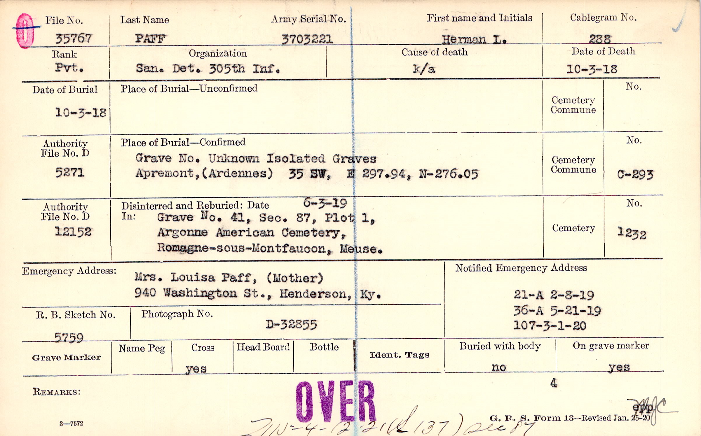 Mrs. Louisa Paff, (Mother), 940 Washington St., Henderson, Ky.