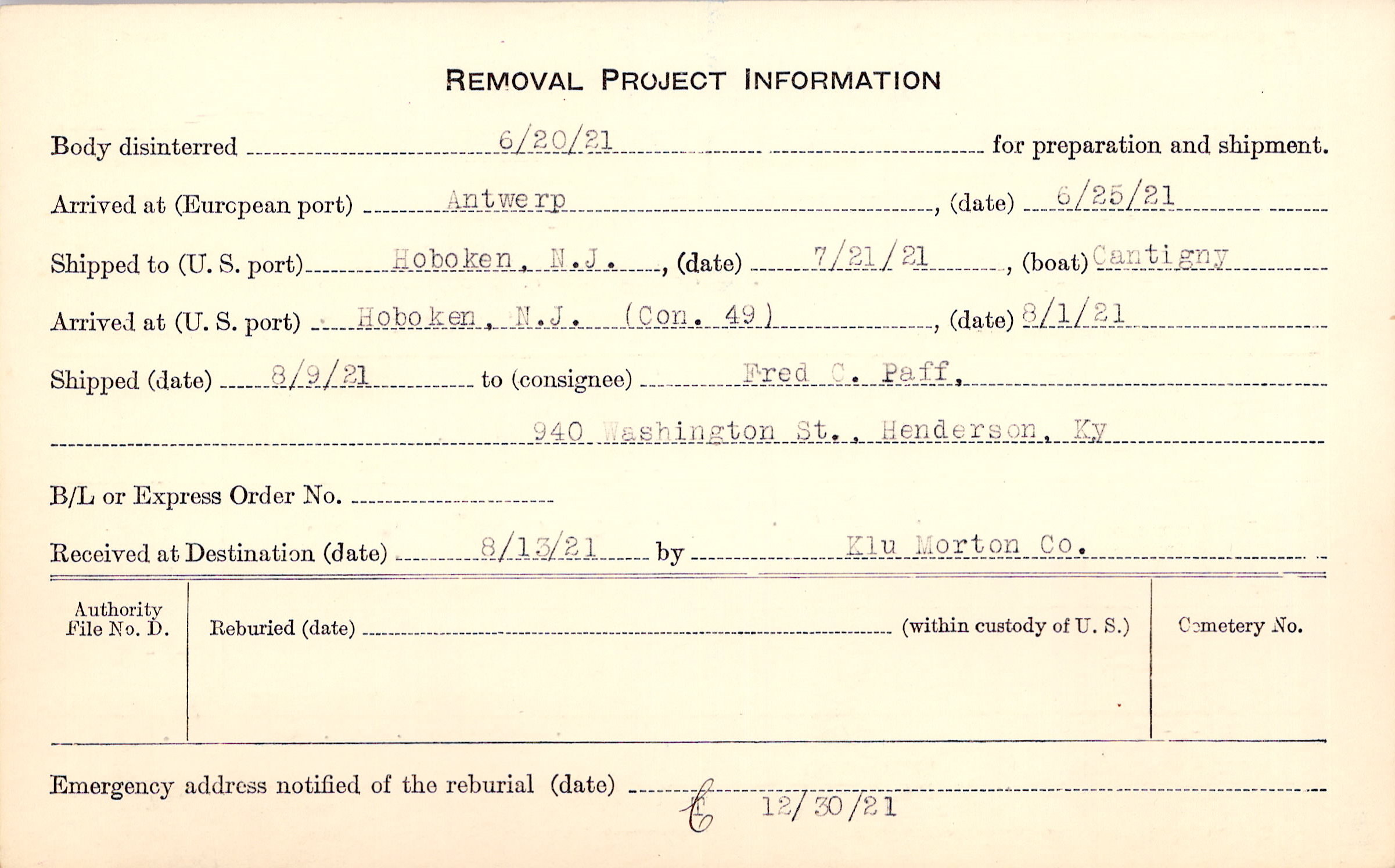 Body disinterred 6/20/1921 for preparation and shipment.