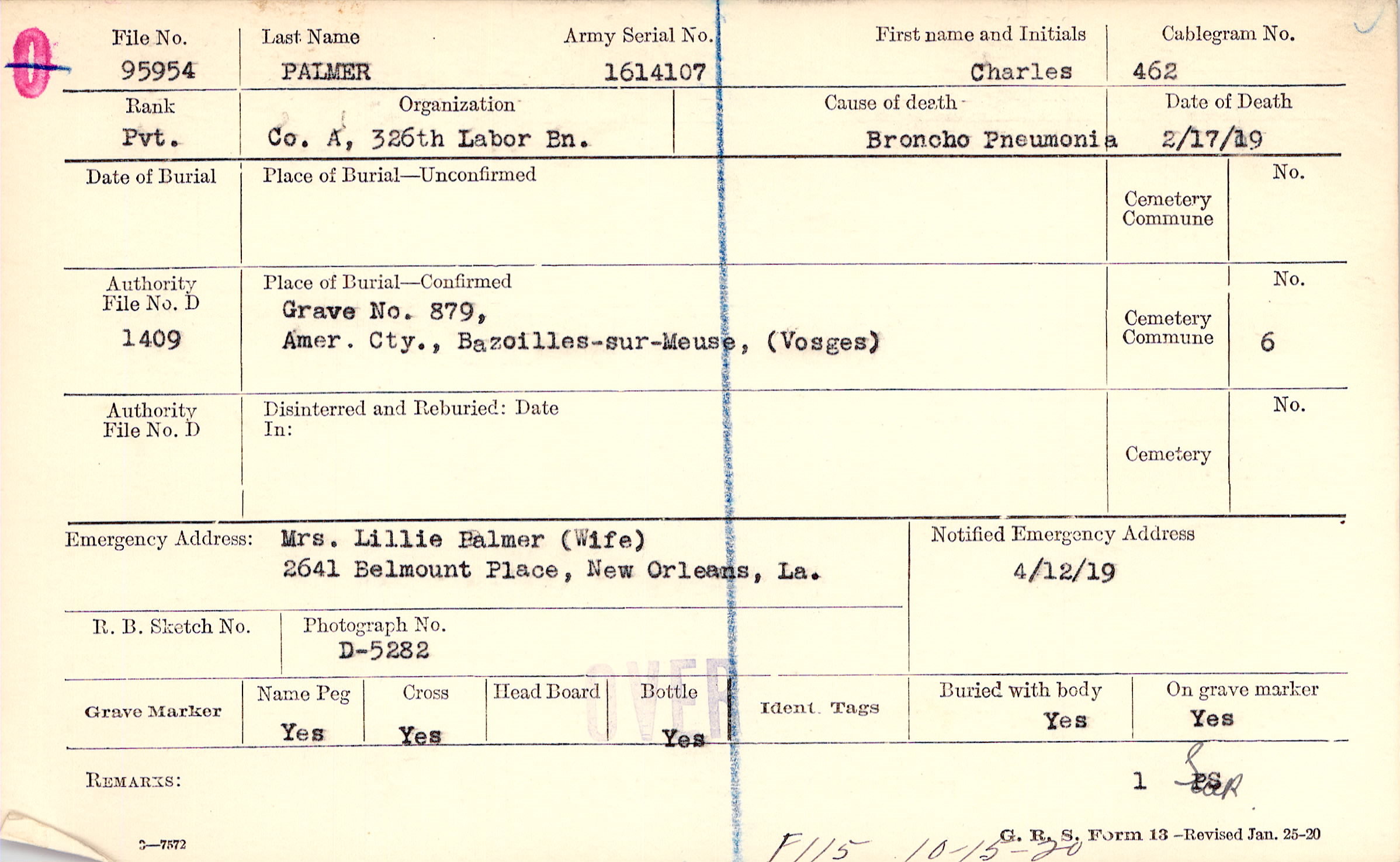 Mrs. Lillie Palmer (Wife), 2641 Belmount Place, New Orleans, La.