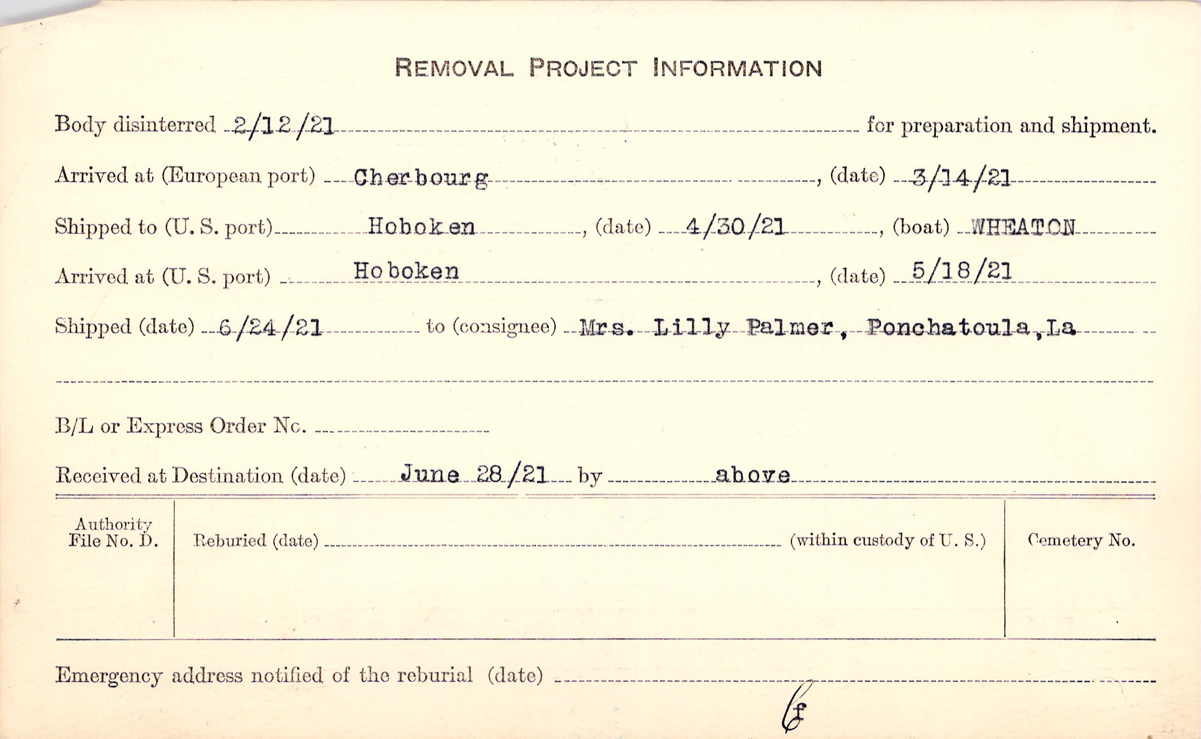 Body disinterred 2/12/1921 for preparation and shipment.