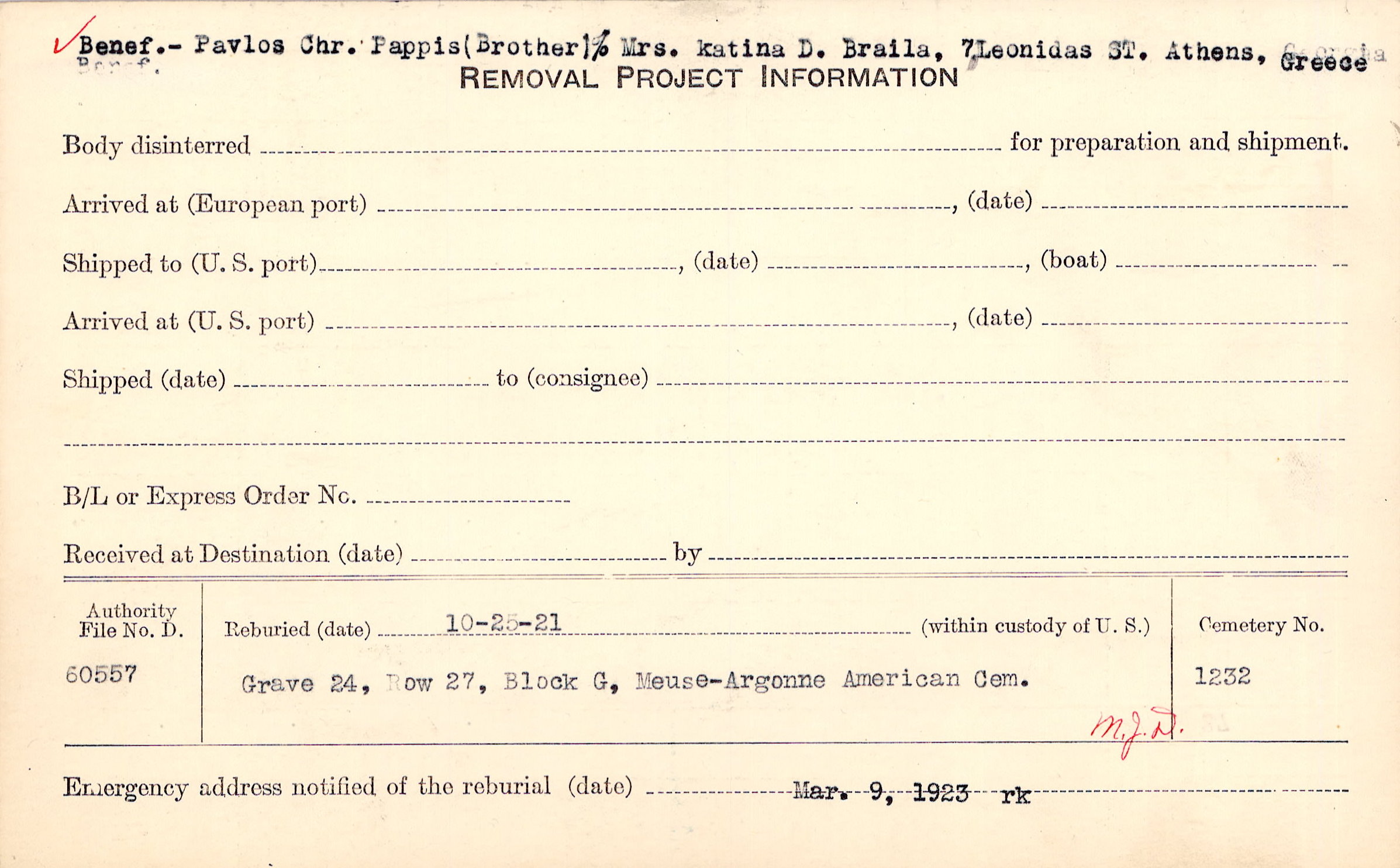 Benef.- Pavlos Chr. Pappis (Brother)% Mrs. Katina D. Braila, 7 Leonidas ST. Athens, Greece |