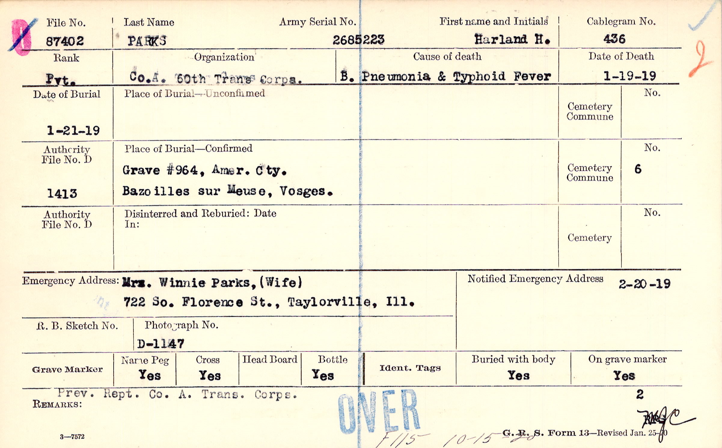 Mrs. Winnie Parks, (Wife), 722 So. Florence St., Taylorville, Ill.