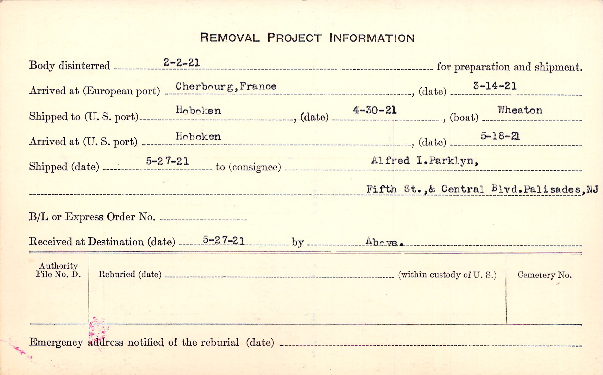 Body disinterred 2/2/1921 for preparation and shipment.