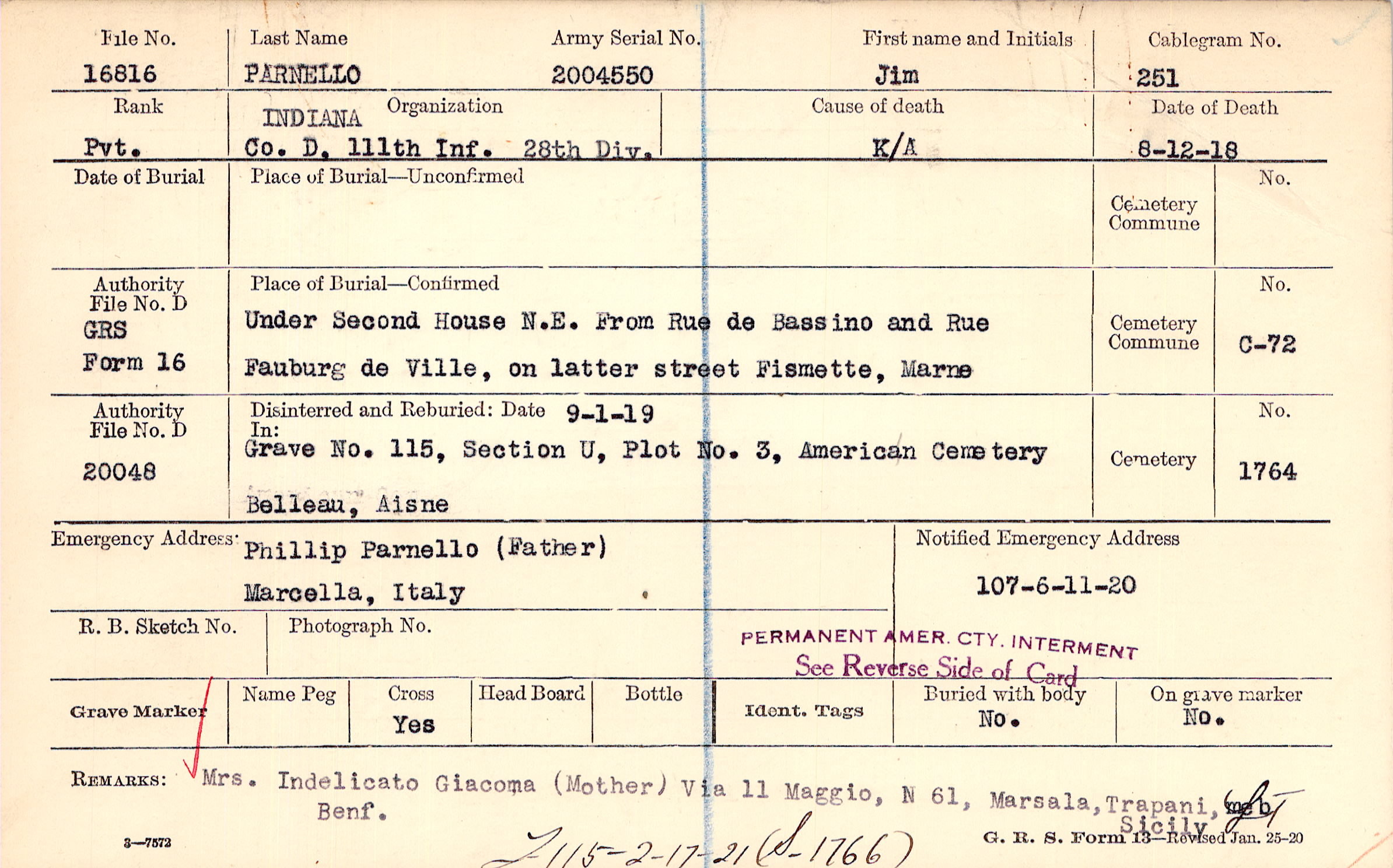 | Permanent Burial in Foreign Cemetery |