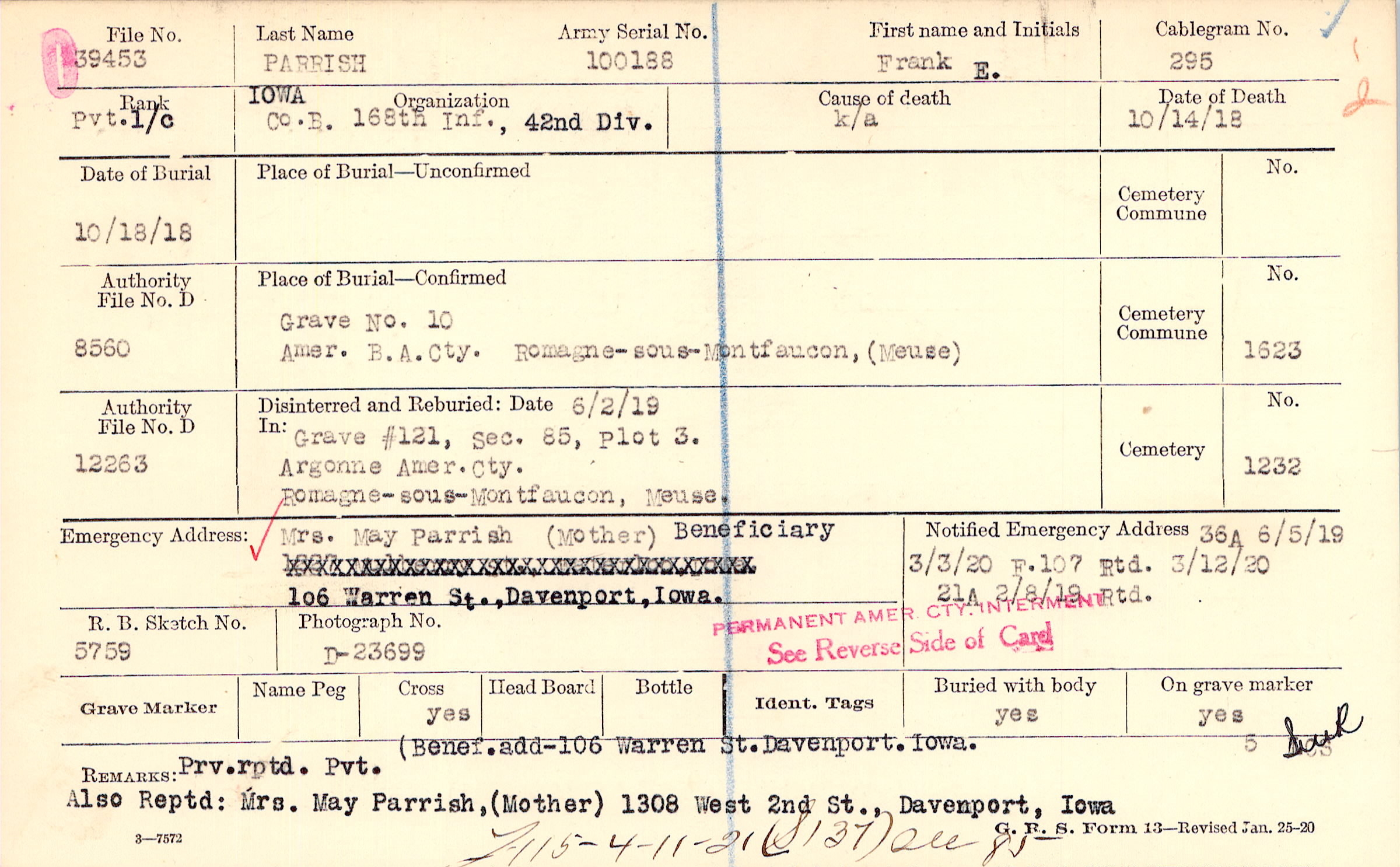 Mrs. May Parrish (Mother), 106 Warren St., Davenport, Iowa., Beneficiary
