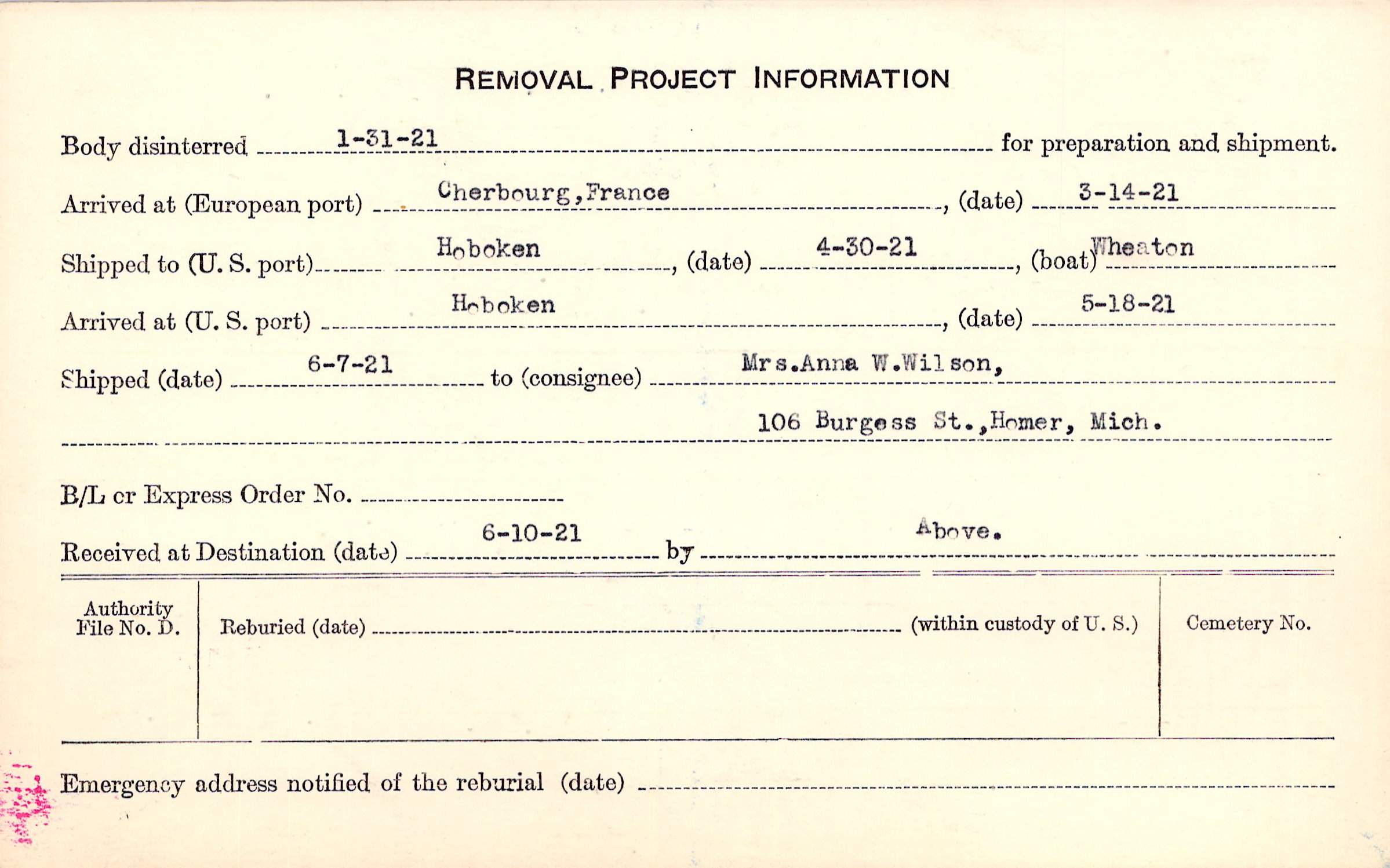 to Mrs. Anna W. Wilson, 106 Burgess St., Homer, Mich.