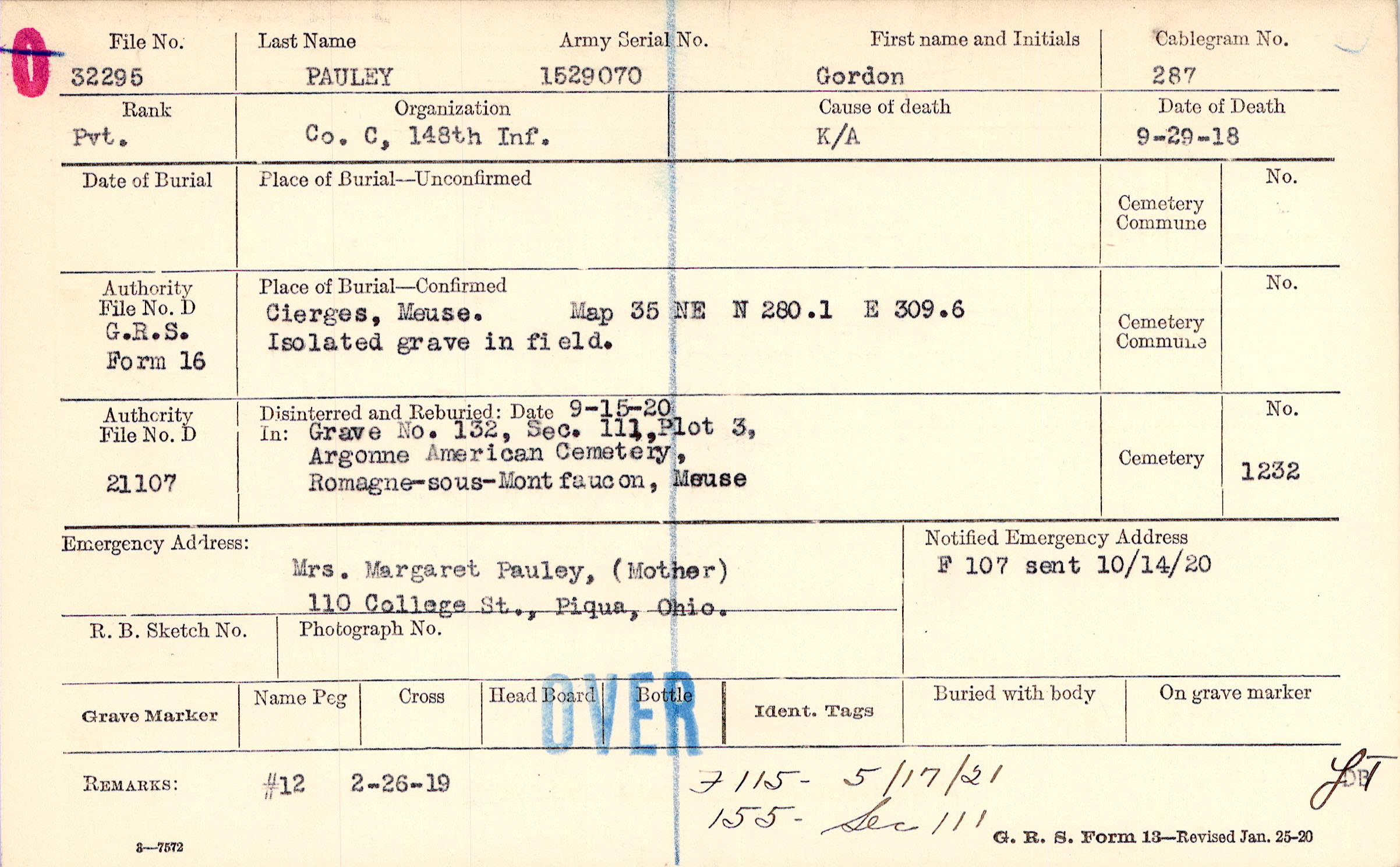 Mrs. Margaret Pauley, (Mother), 110 College St., Piqua, Ohio.