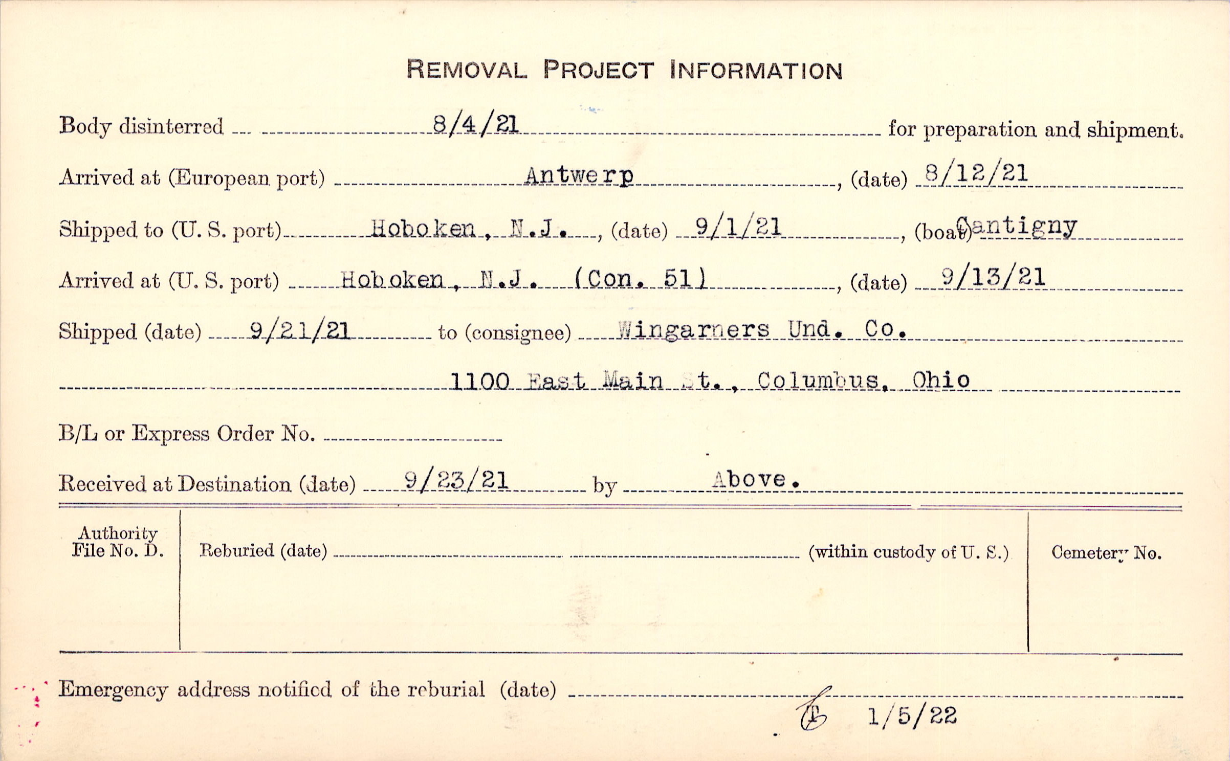Body disinterred 8/4/1921 for preparation and shipment.