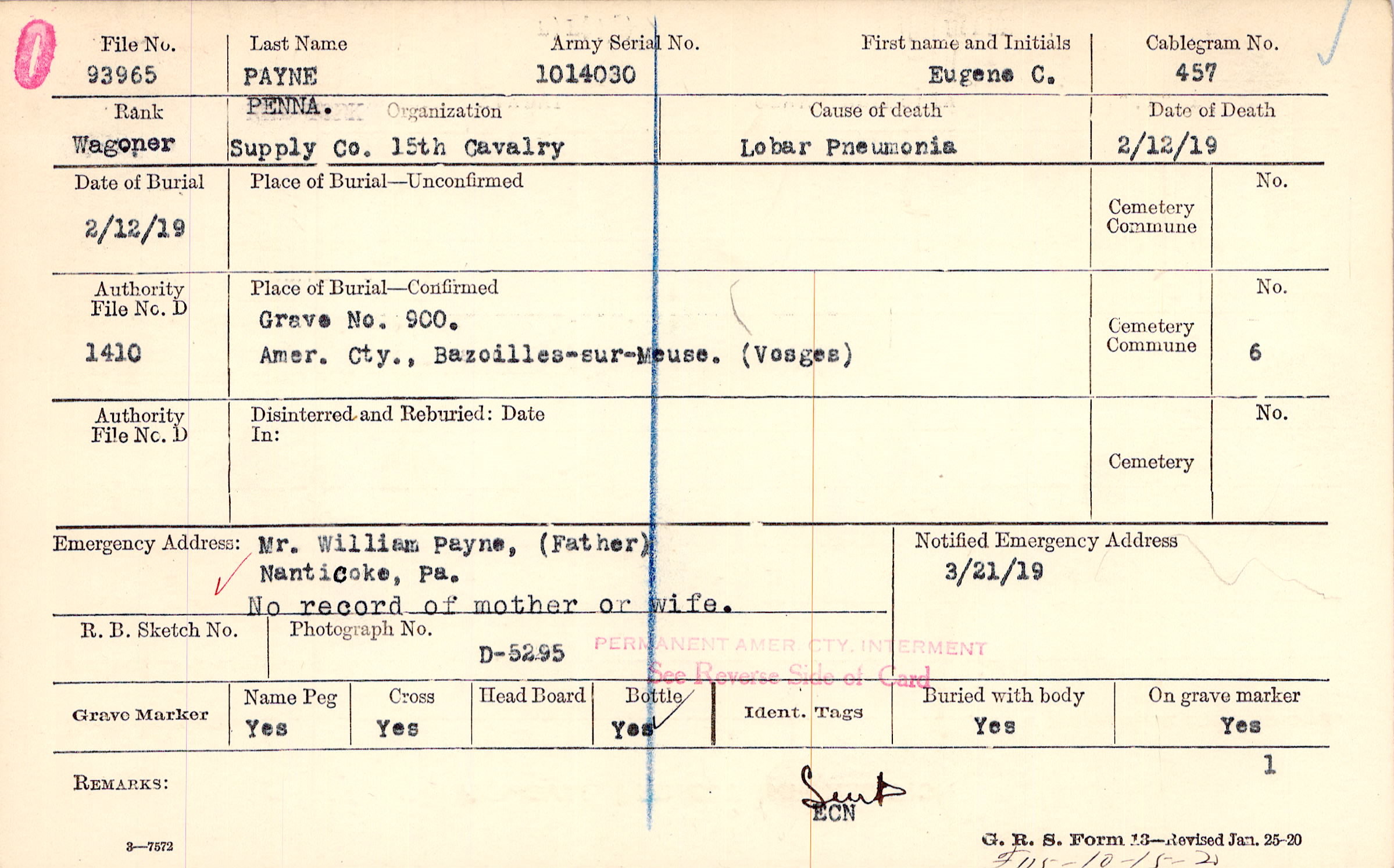 Mr. William Payne, (Father), Nanticoke, Pa., No record of mother or wife.