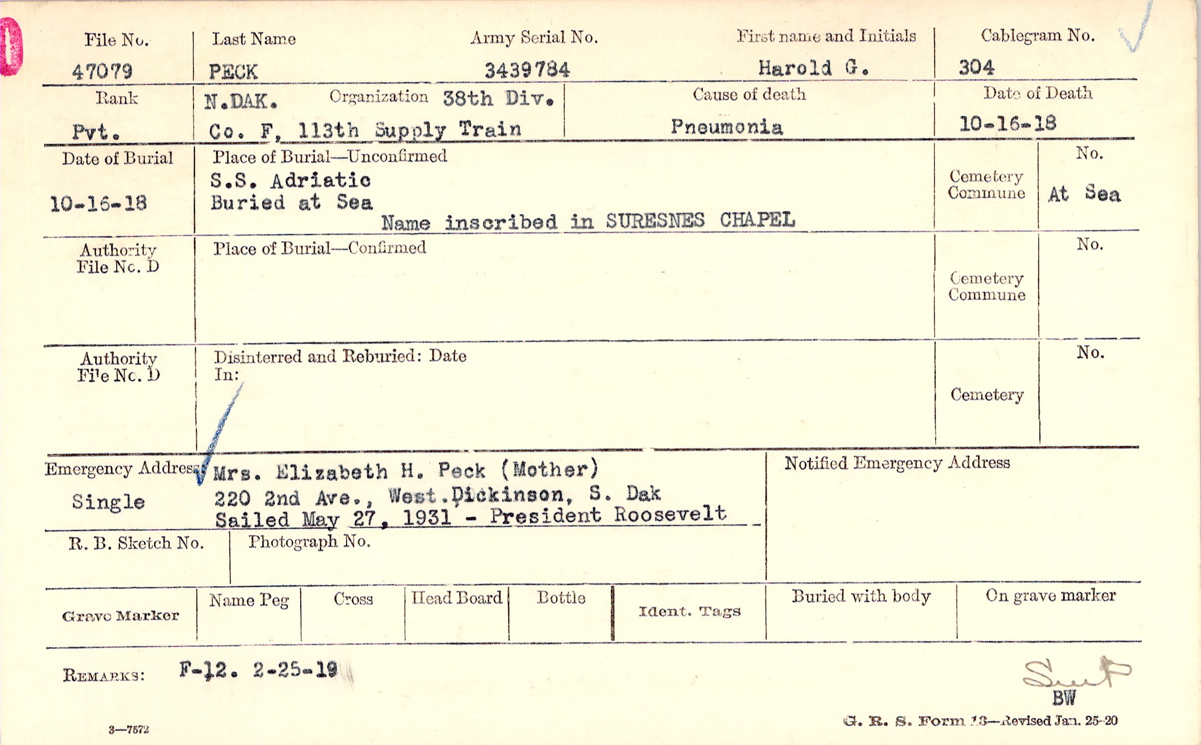 Mrs. Elizabeth H. Peck (Mother), 220 2nd Ave., West. Dickinson, S. Dak, Single Sailed May 27, 1931 - President Roosevelt