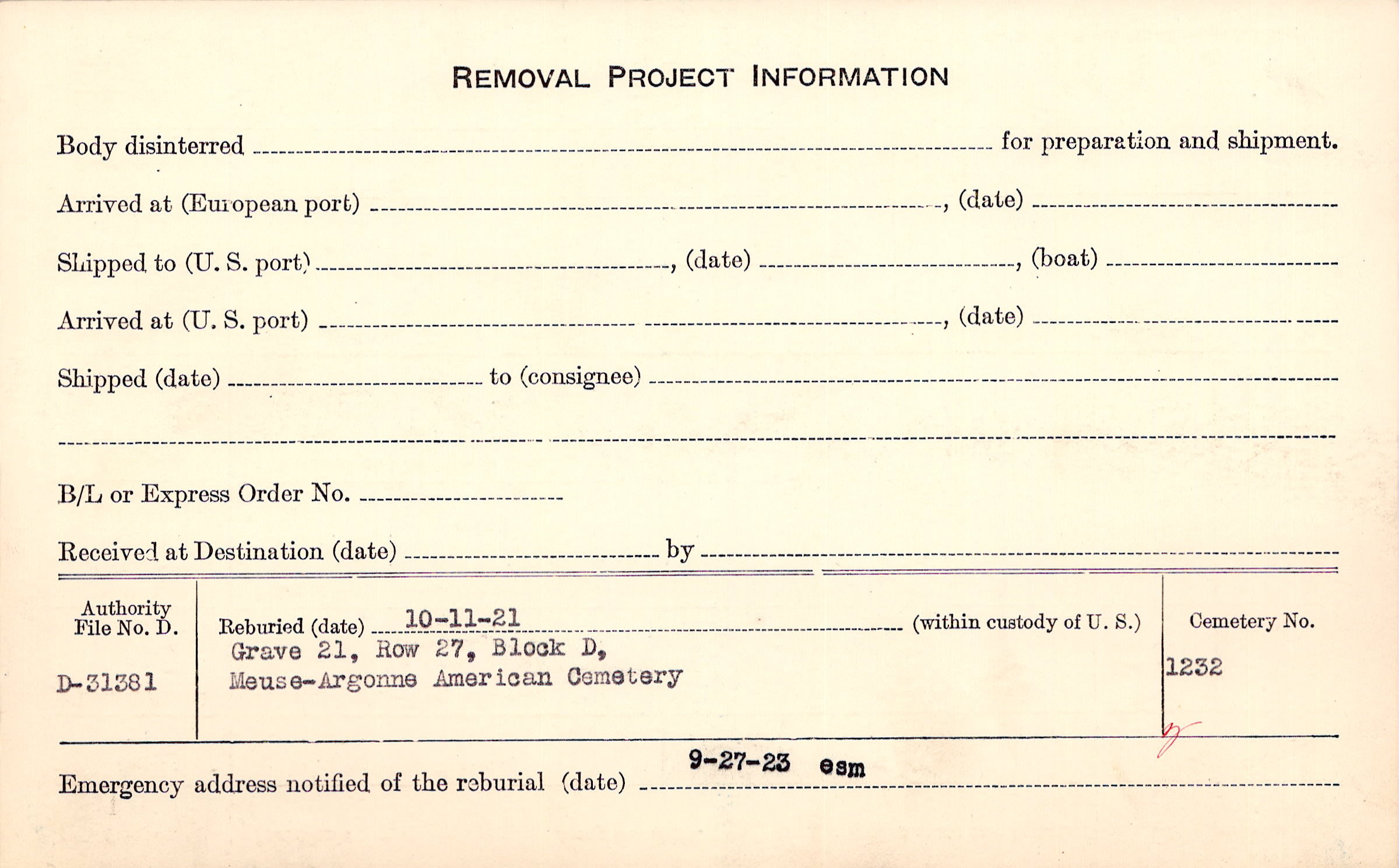 | Permanent Burial in Foreign Cemetery |
