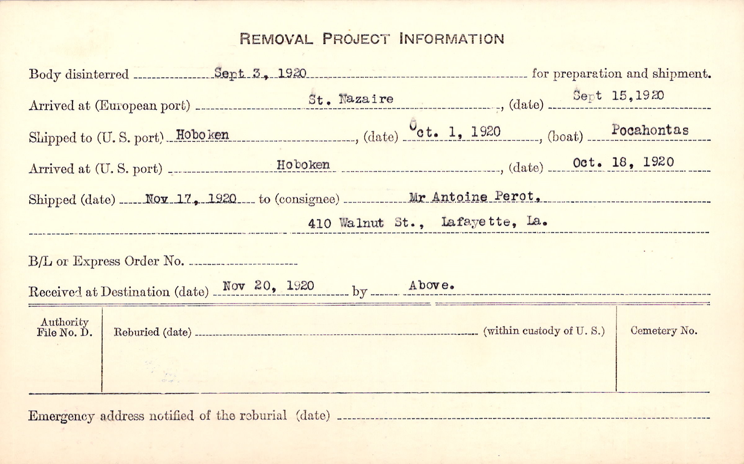 Body disinterred 9/3/1920 for preparation and shipment.