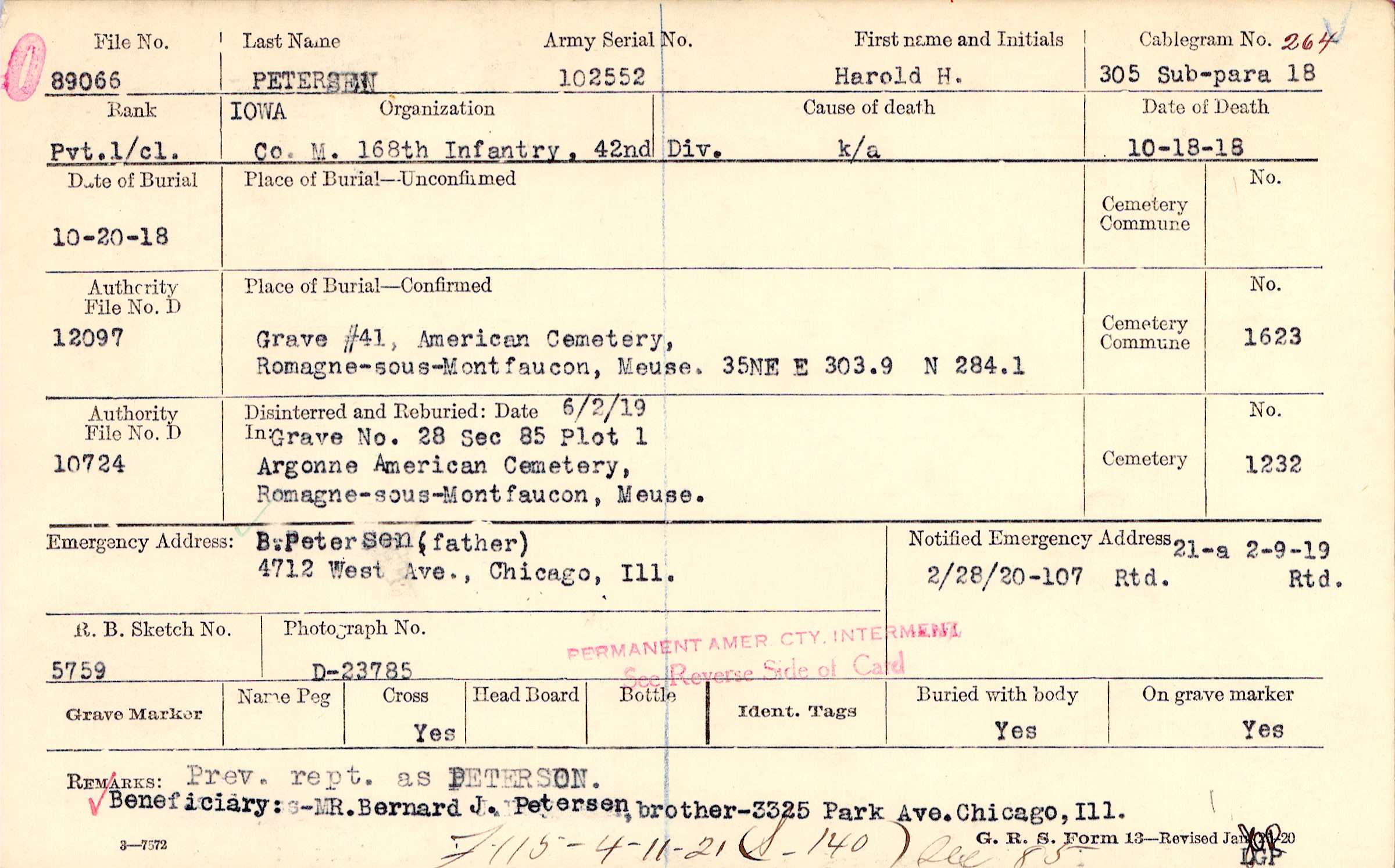 Prev. rept. as Peterson. Beneficiary: Mr. Bernard J. Petersen, brother - 3325 Park Ave. Chicago, Ill., F115 - 4-11-21 (S-140)sec 85