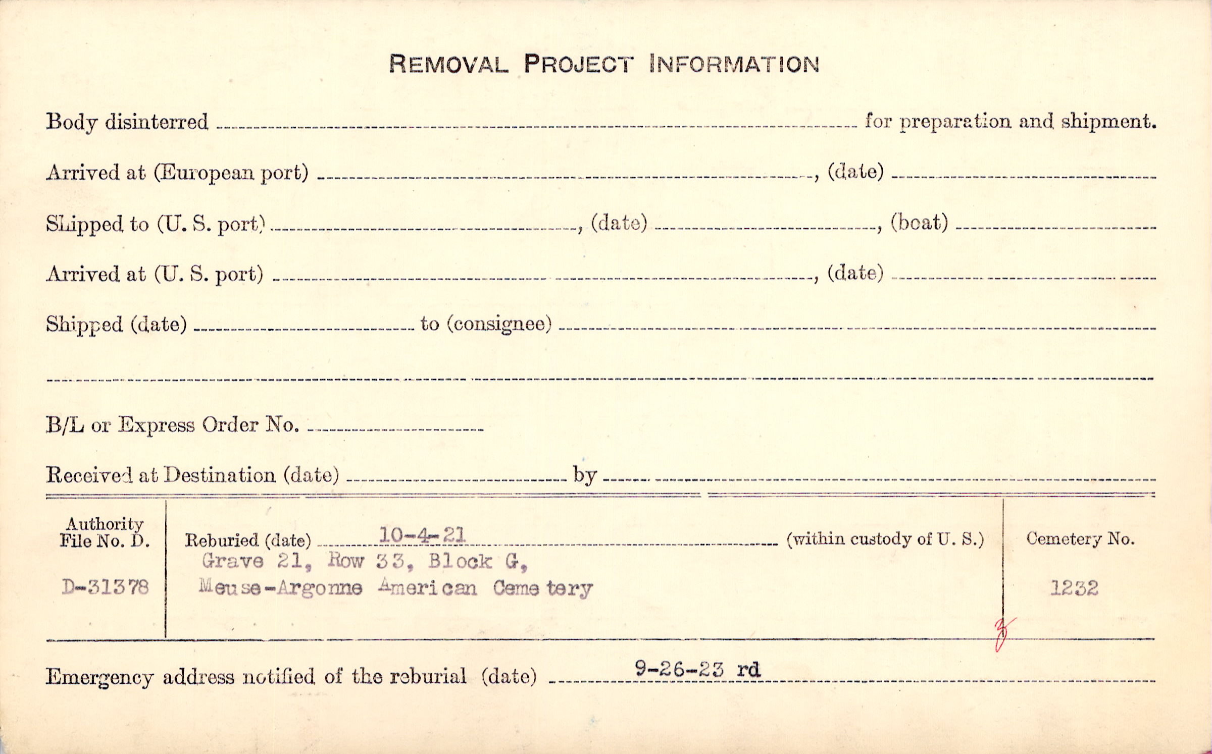 Grave 28, Section 85, Plot 1, Argonne American Cemetery, Romagne-sous-Montfaucon, Meuse