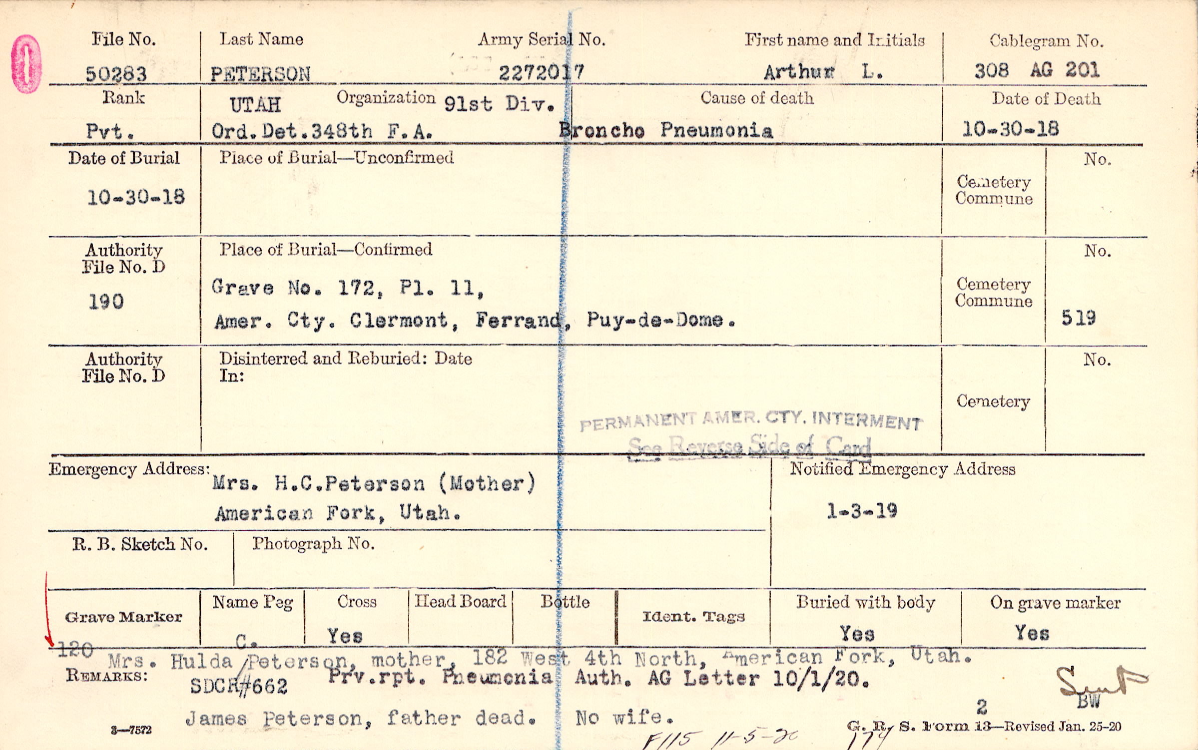 Mrs. Hulda Peterson, mother, 182 West 4th North, American Fork, Utah. Prv. rpt. Pneumonia Auth. AG Letter 10/1/20. James Peterson, father dead. No wife., F115 11-5-20 174, SDCR #662 Prv. rpt. Pneumonia Auth. AG Letter 10/1/20.