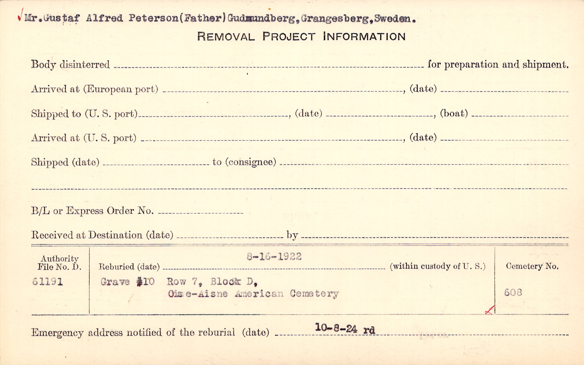 Mr. Gustaf Alfred Peterson (Father) Gudmundberg, Grangesberg, Sweden. |