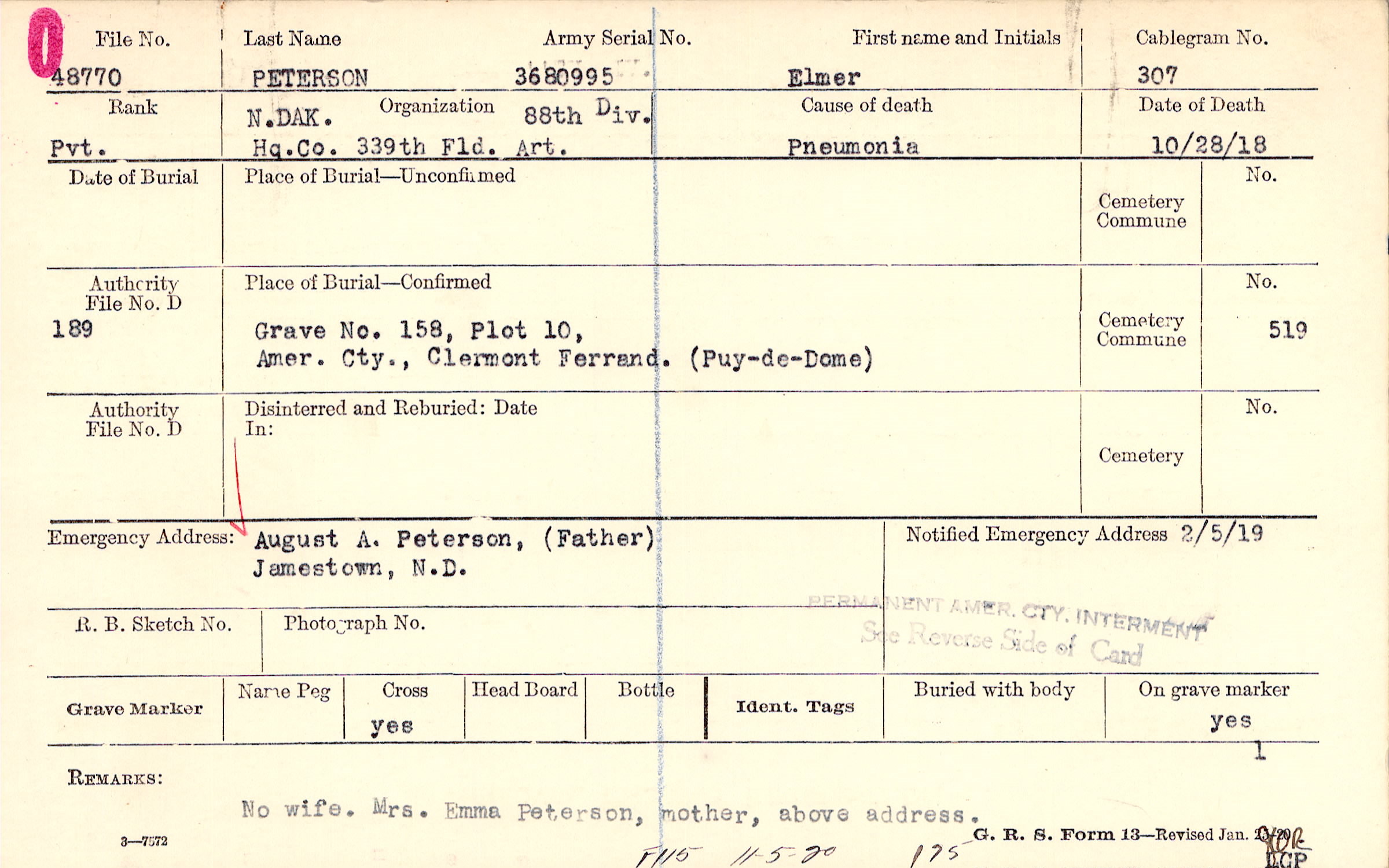 No Wife. Mrs. Emma Peterson, Mother, above Address., F115 11-5-20 175