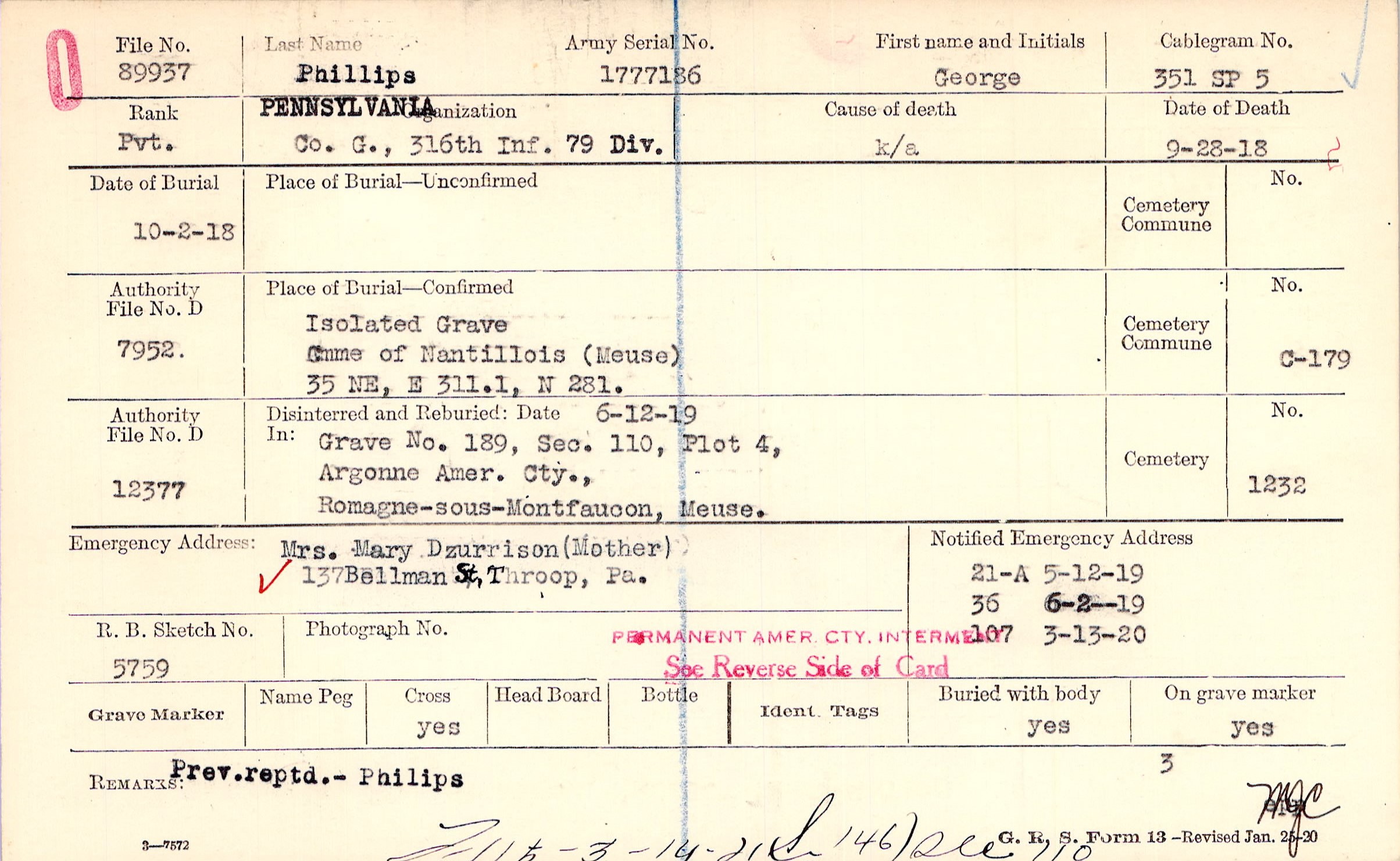 Mrs. Mary Dzurrison (Mother), 137 Bellman St., Throop, Pa.