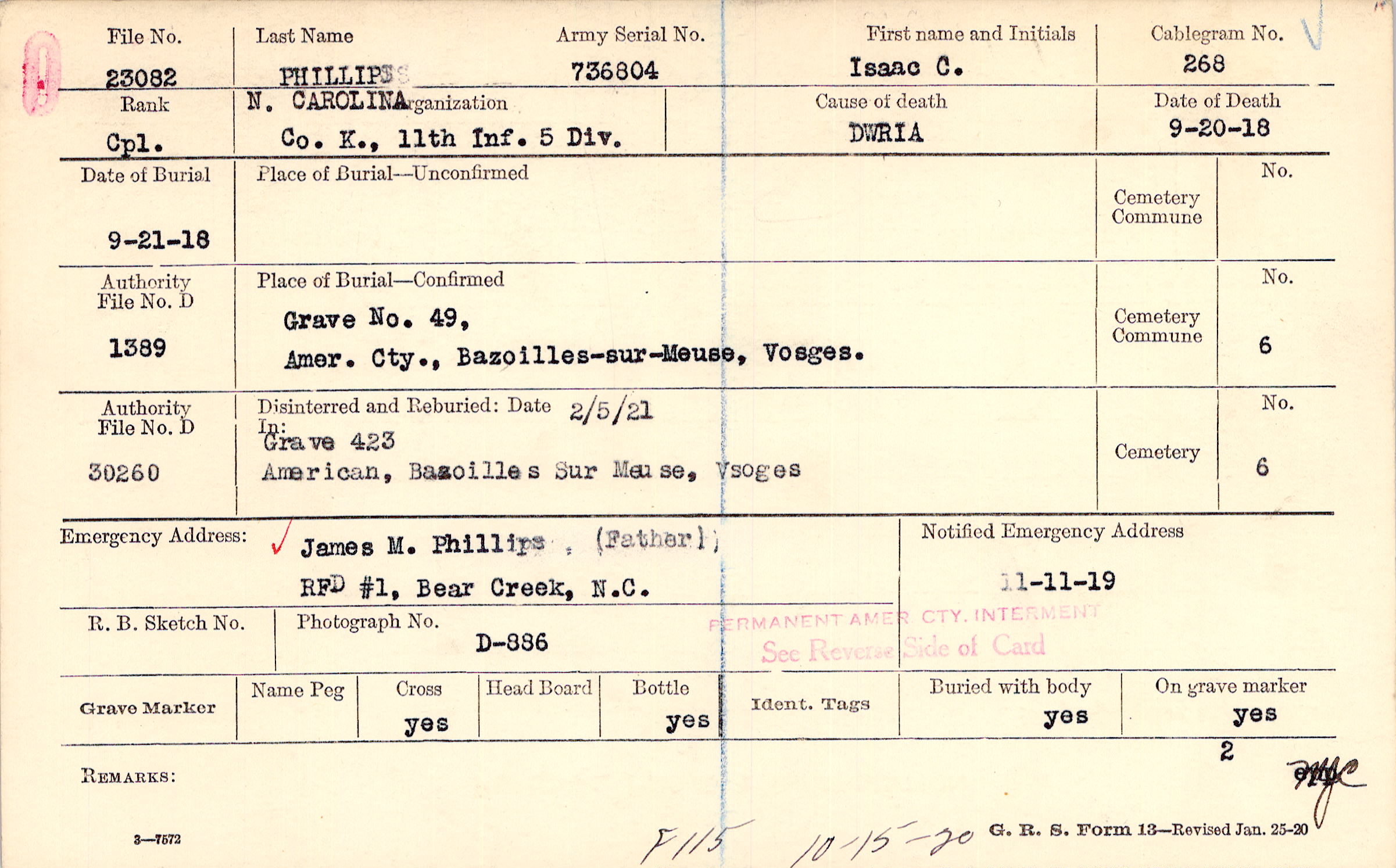 James M. Phillips , (Father), RFD #1, Bear Creek, N.C.