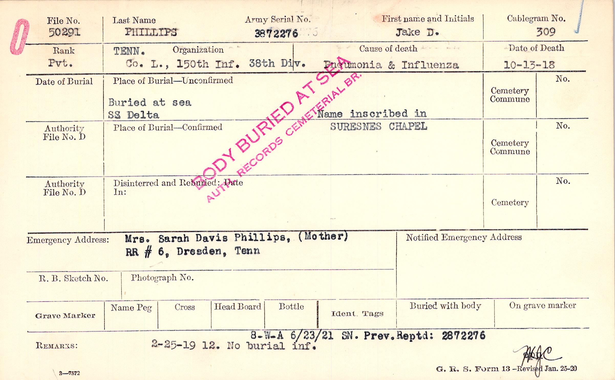 8-W-A 6/23/21 SN. Prev. Reptd: 2872276, 2-25-19 12. No burial inf.
