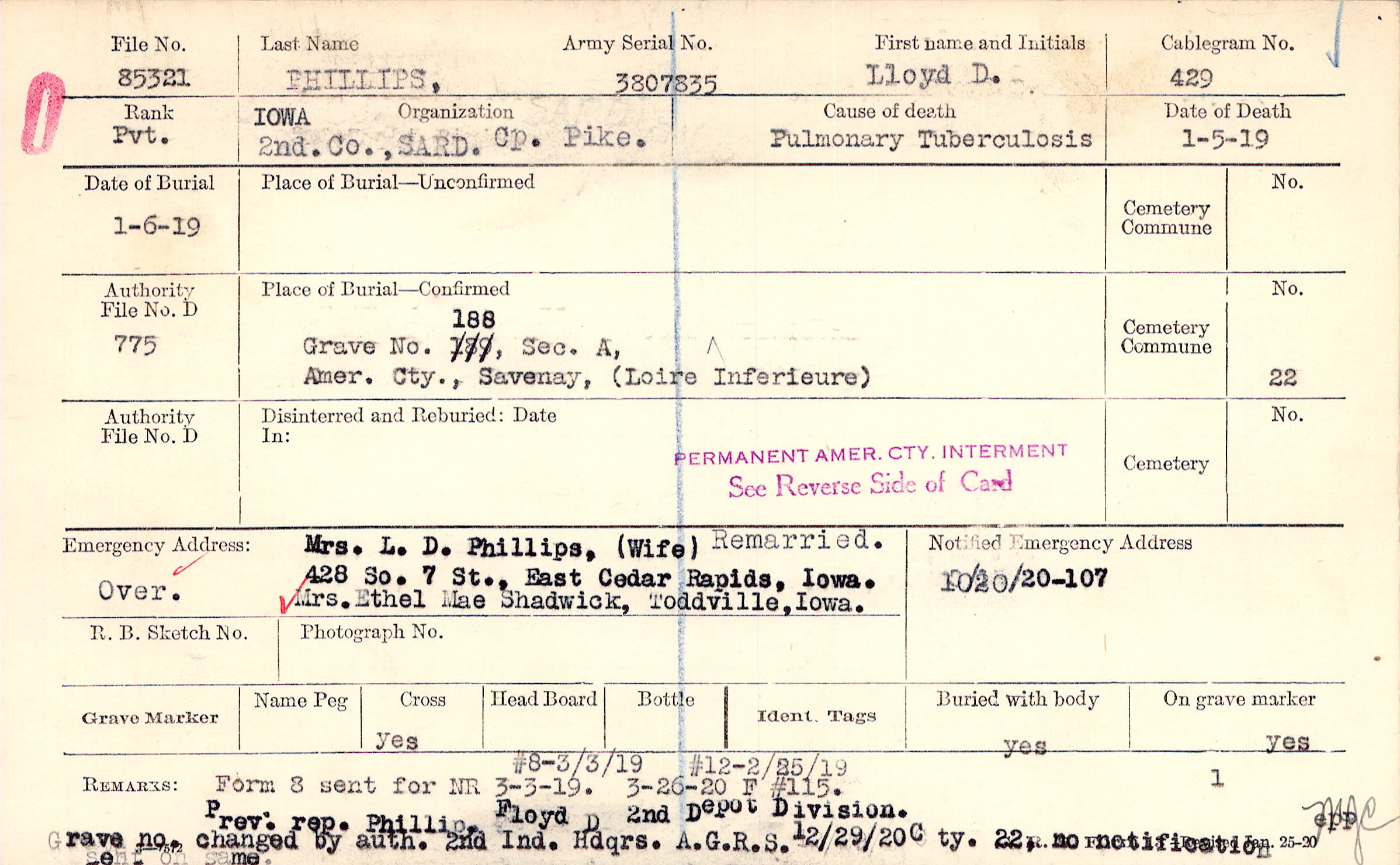 Prev. rep. Phillip, Floyd D, 2nd Depot Division Grave no. changed by auth. 2nd Ind. Hdqrs. A.G.R.S. 12/29/20 Cty 22, no notification sent on same, #8-3/3/19 Form 8 sent for NR 3-3-19, #12-2/25/19, 3-26-20 F #115