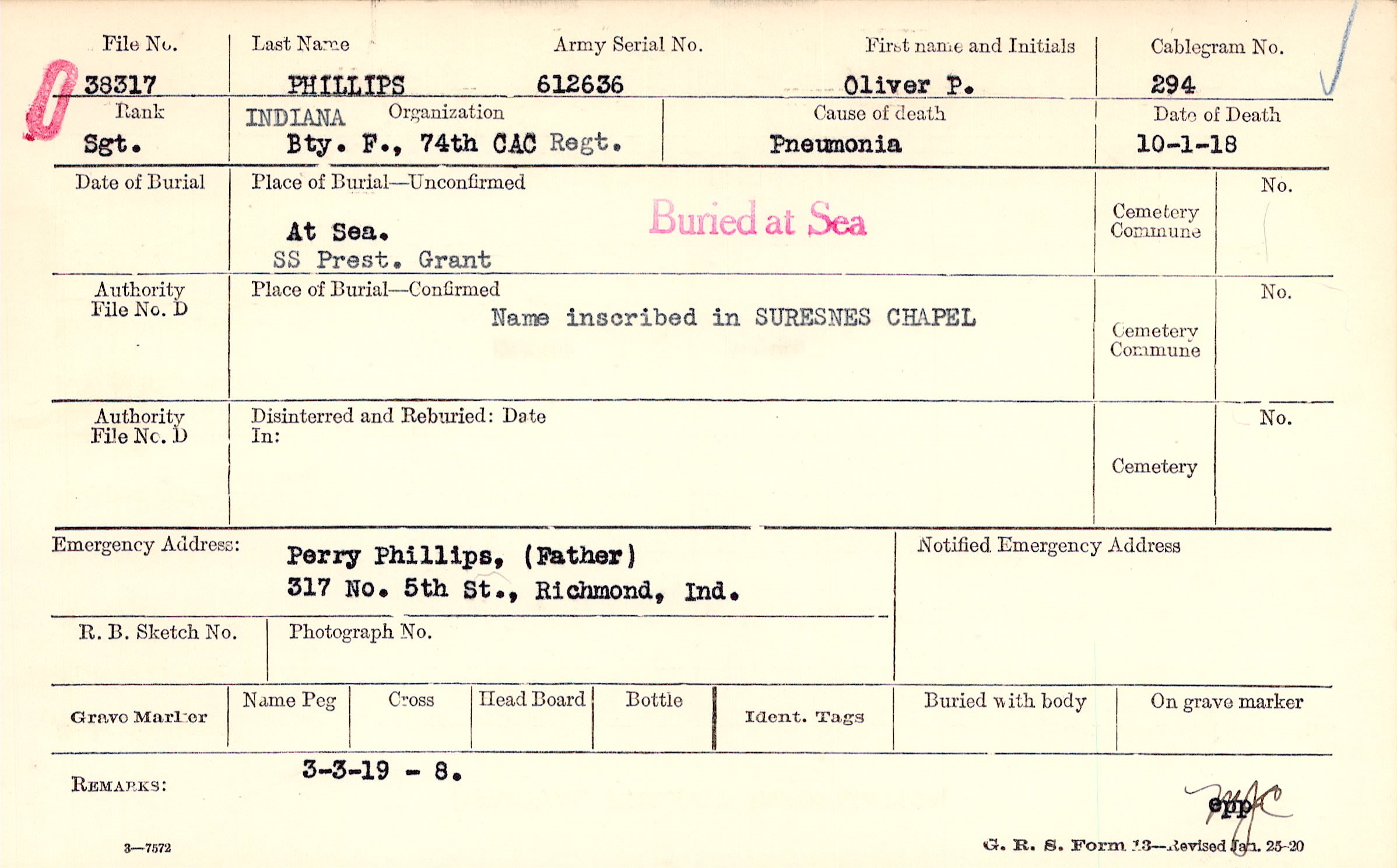Perry Phillips, (Father), 317 No. 5th St., Richmond, Ind., 3-319 - 8.