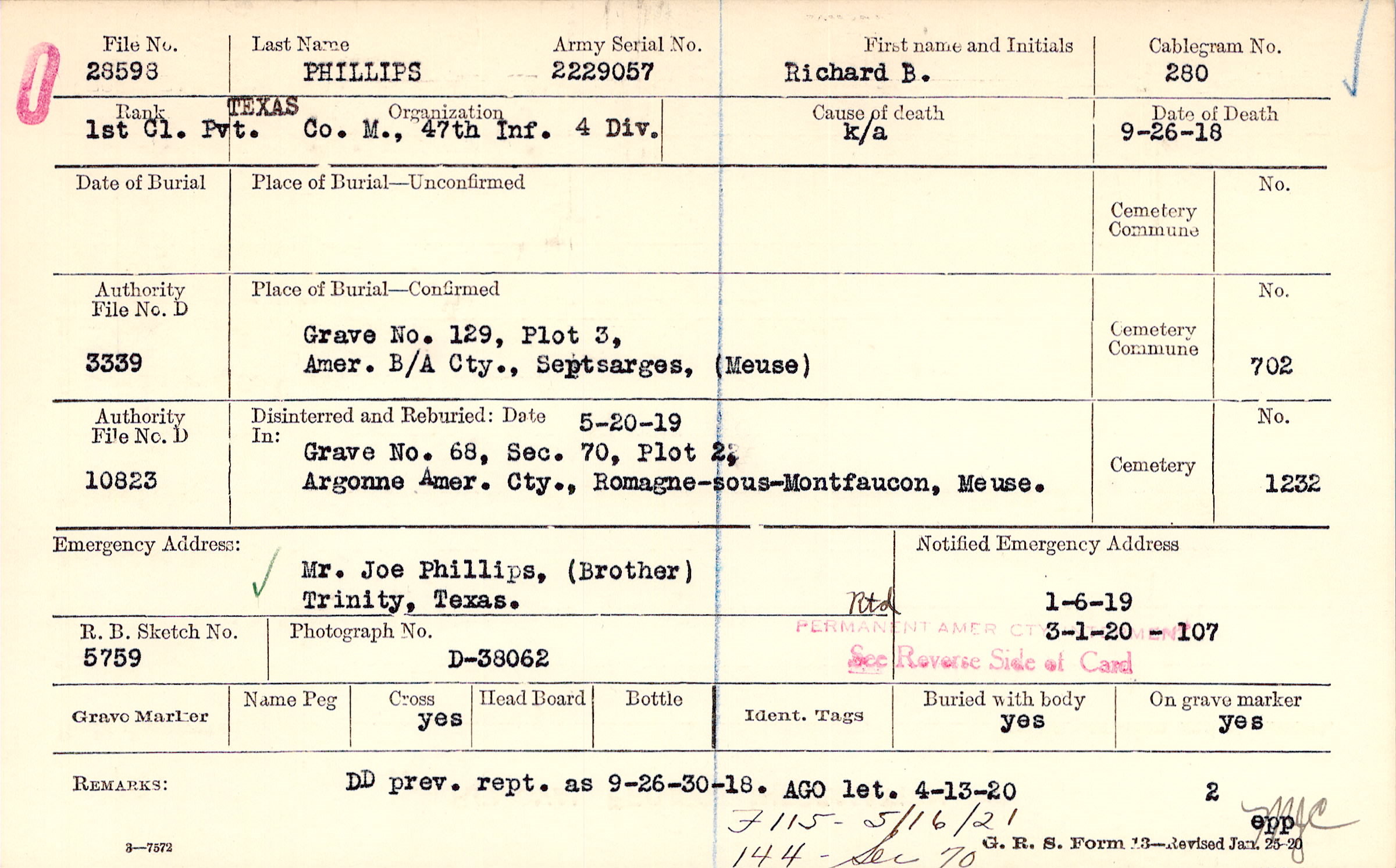 Grave 129, Plot 3, Amer. B/A Cty., Septsarges, Meuse