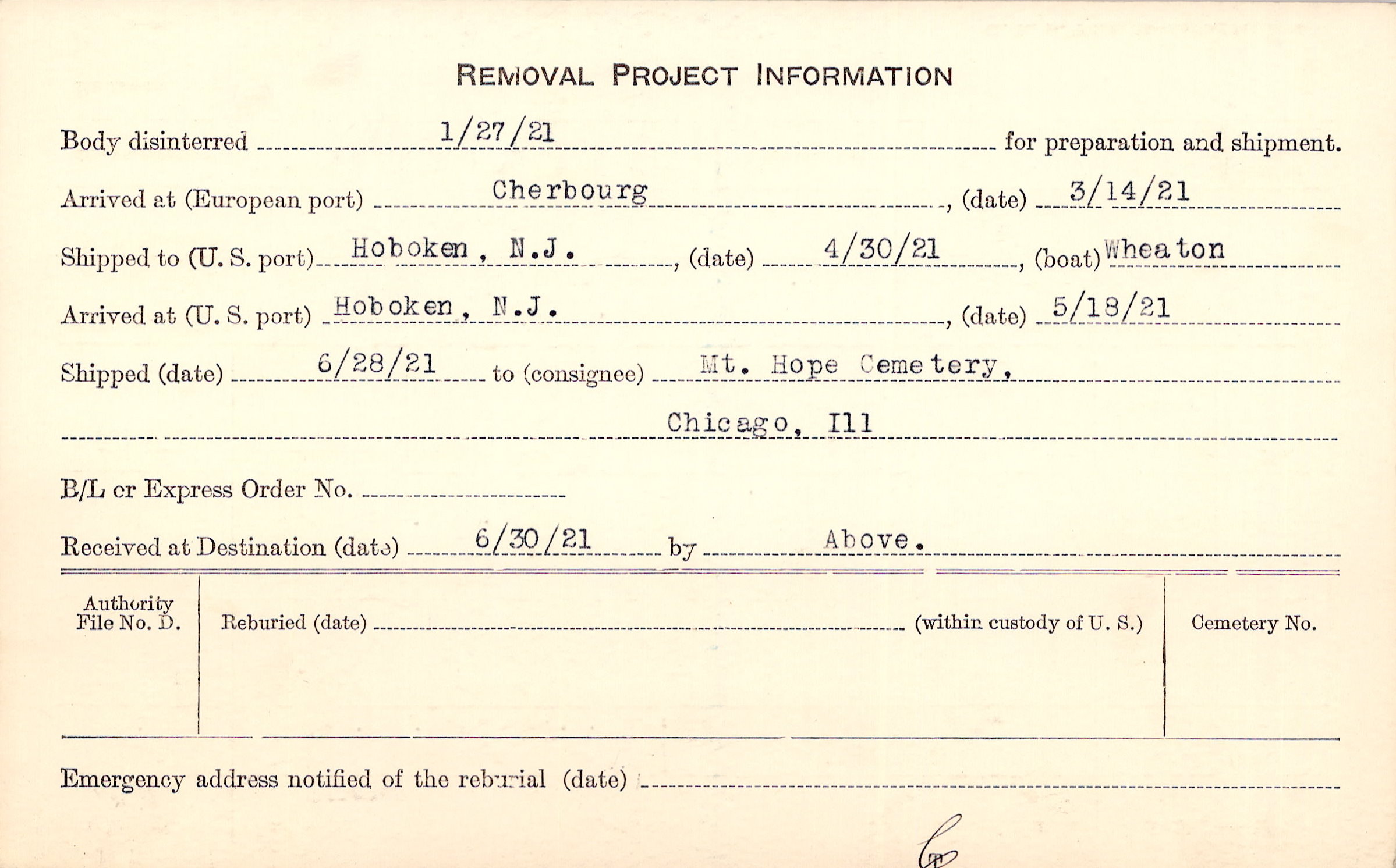 Body disinterred 1/27/1921 for preparation and shipment.