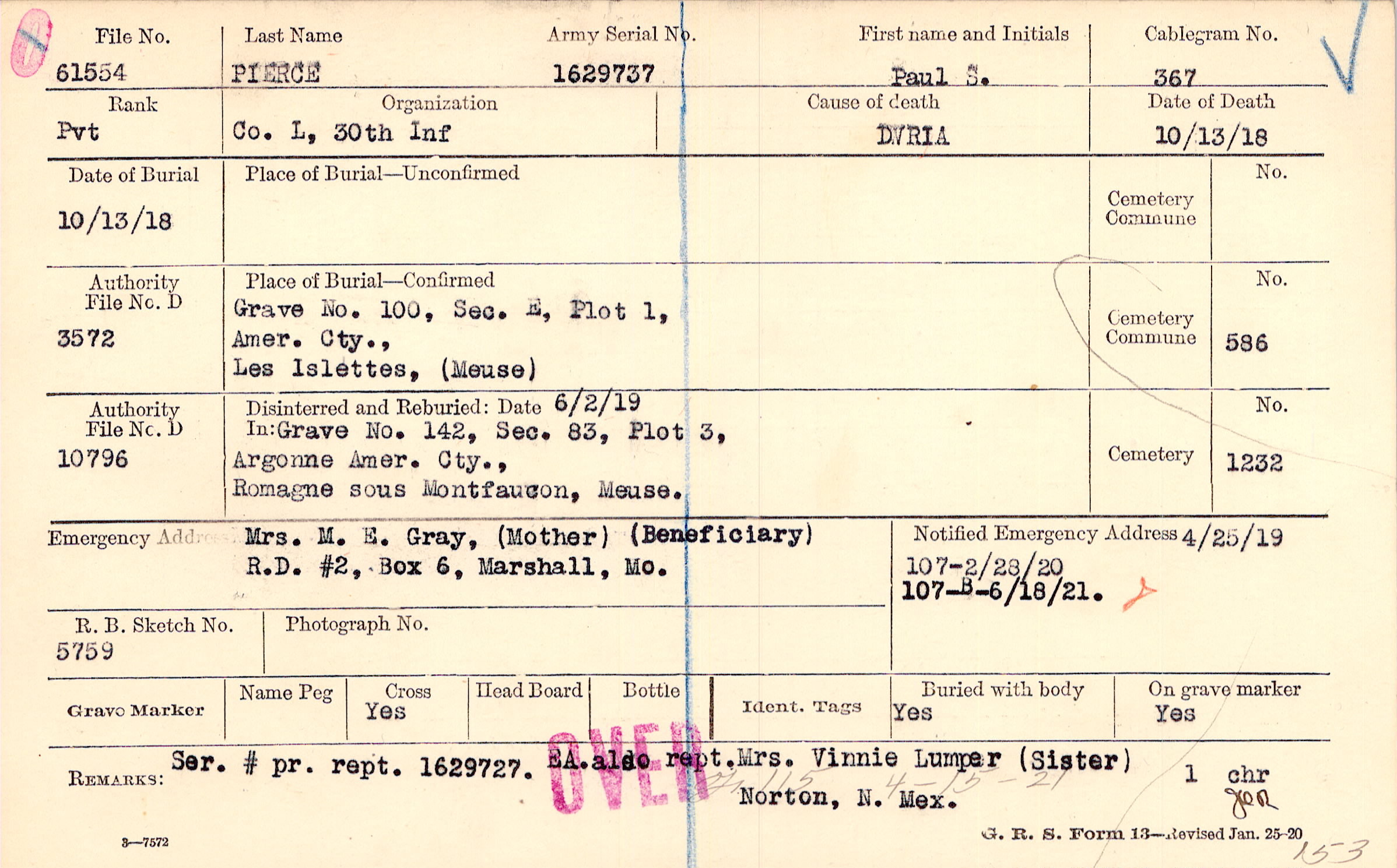 Mrs. M. E. Gray, (Mother), R.D. #2, Box 6, Marshall, Mo., (Beneficiary)