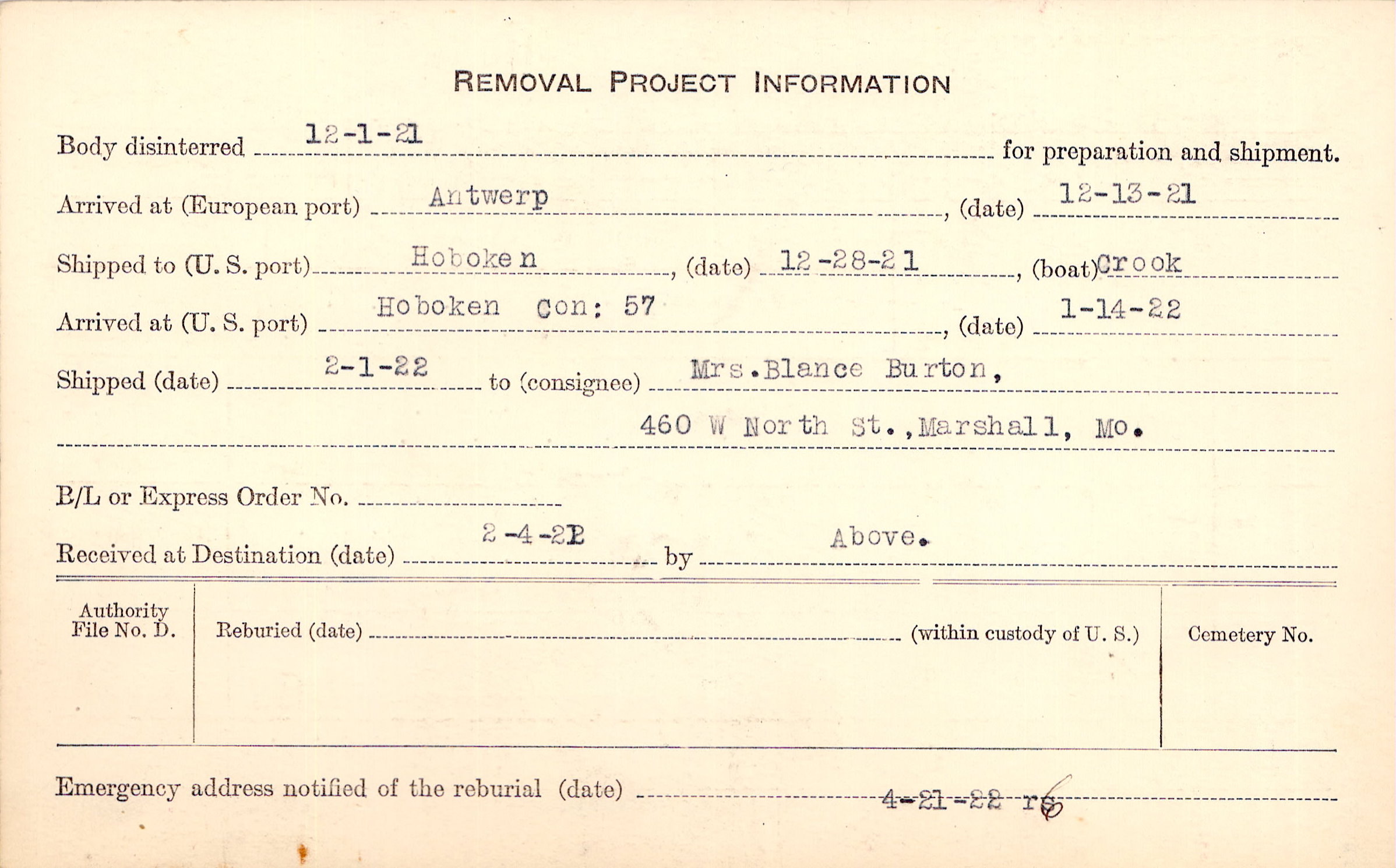 Body disinterred 12/1/1921 for preparation and shipment.