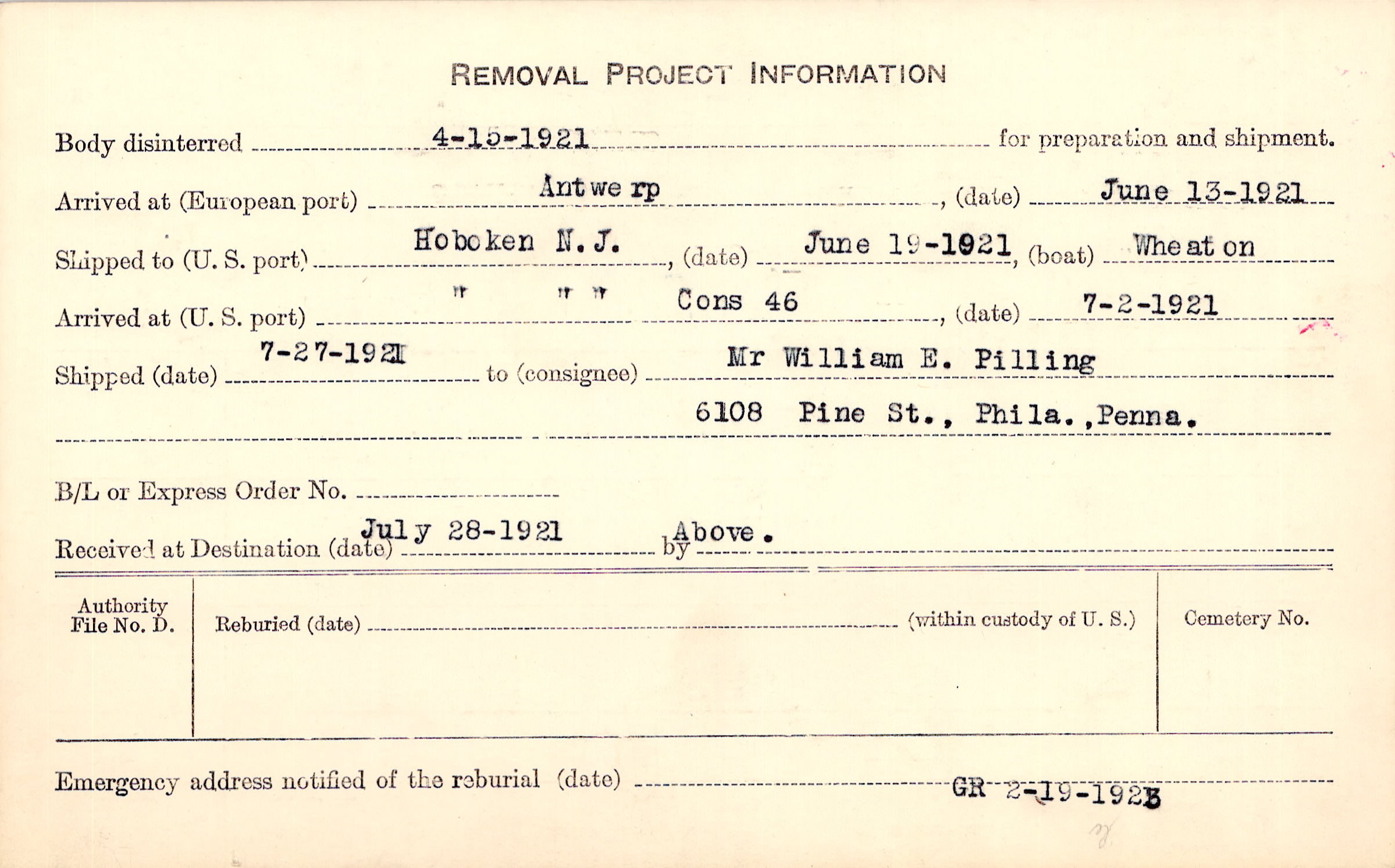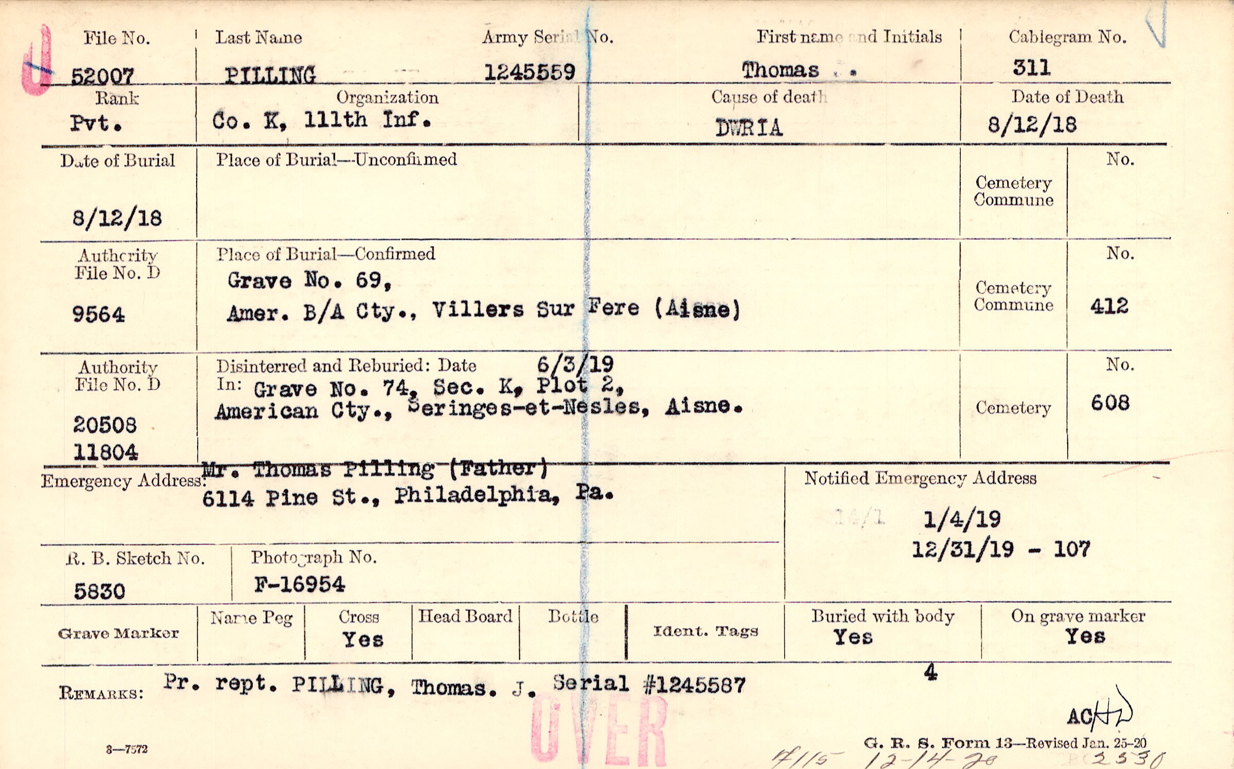 Mr. Thomas Pilling (Father), 6114 Pine St., Philadelphia, Pa.