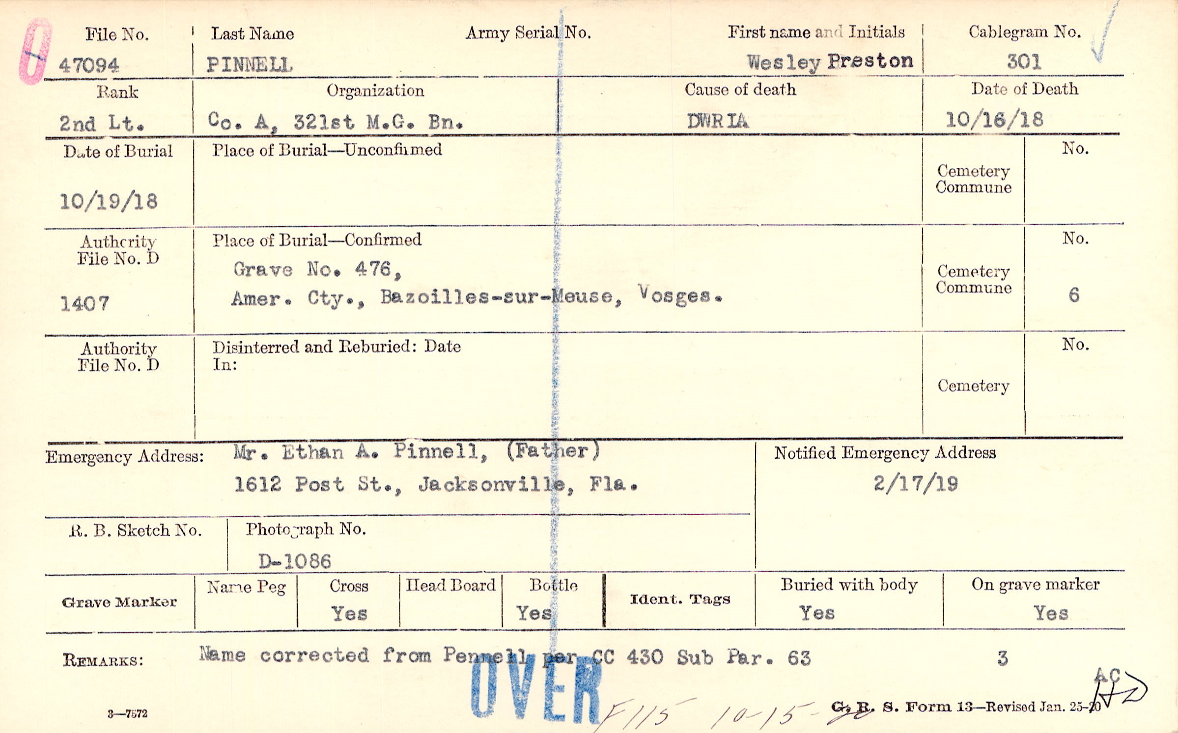 Mr. Ethan A. Pinnell, (Father), 1612 Post St., Jacksonville, Fla.