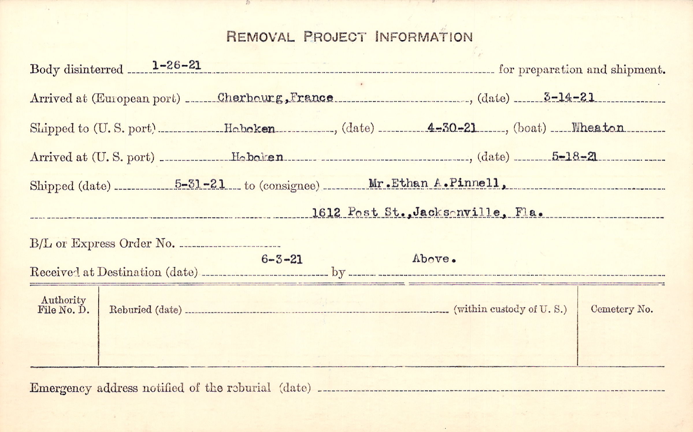 Body disinterred 1/26/1921 for preparation and shipment.