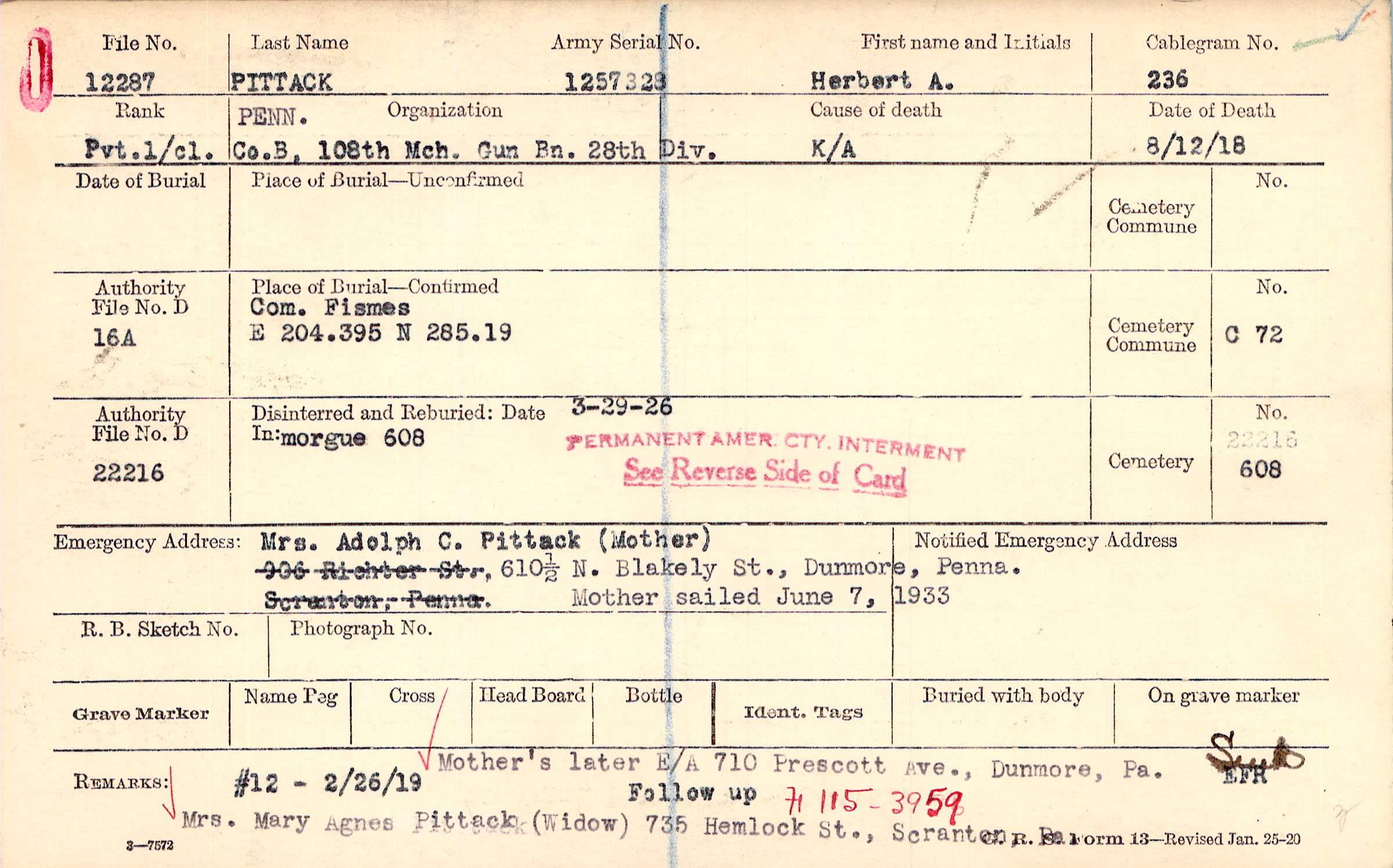 Mrs. Adolph C. Pittack (Mother), 610 1/2 N. Blakely St., Dunmore, Penna., Mother sailed June 7, 1933