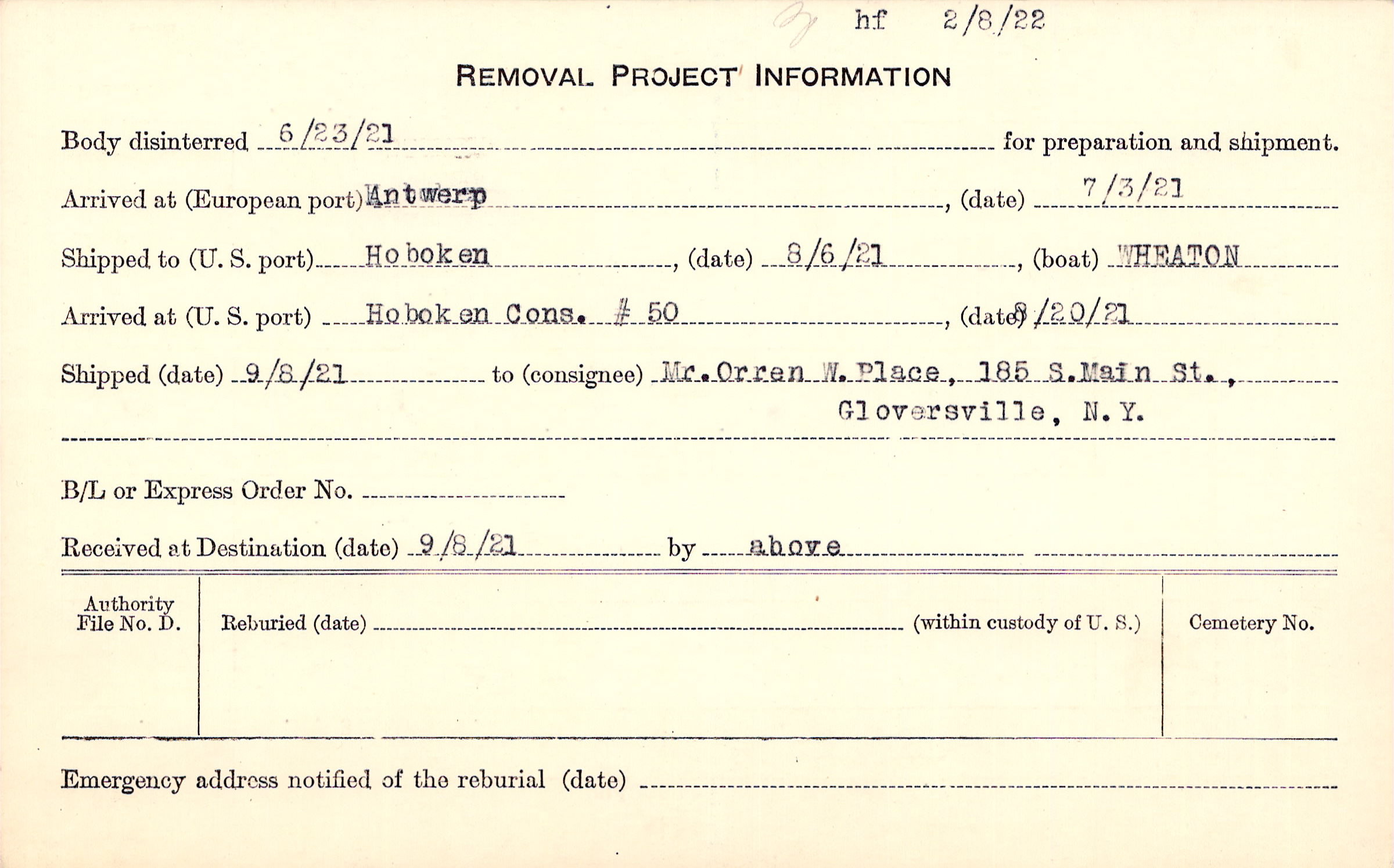 Mr. Oren Place (Brother), 6 Fosdick St., Gloversville, N.Y.