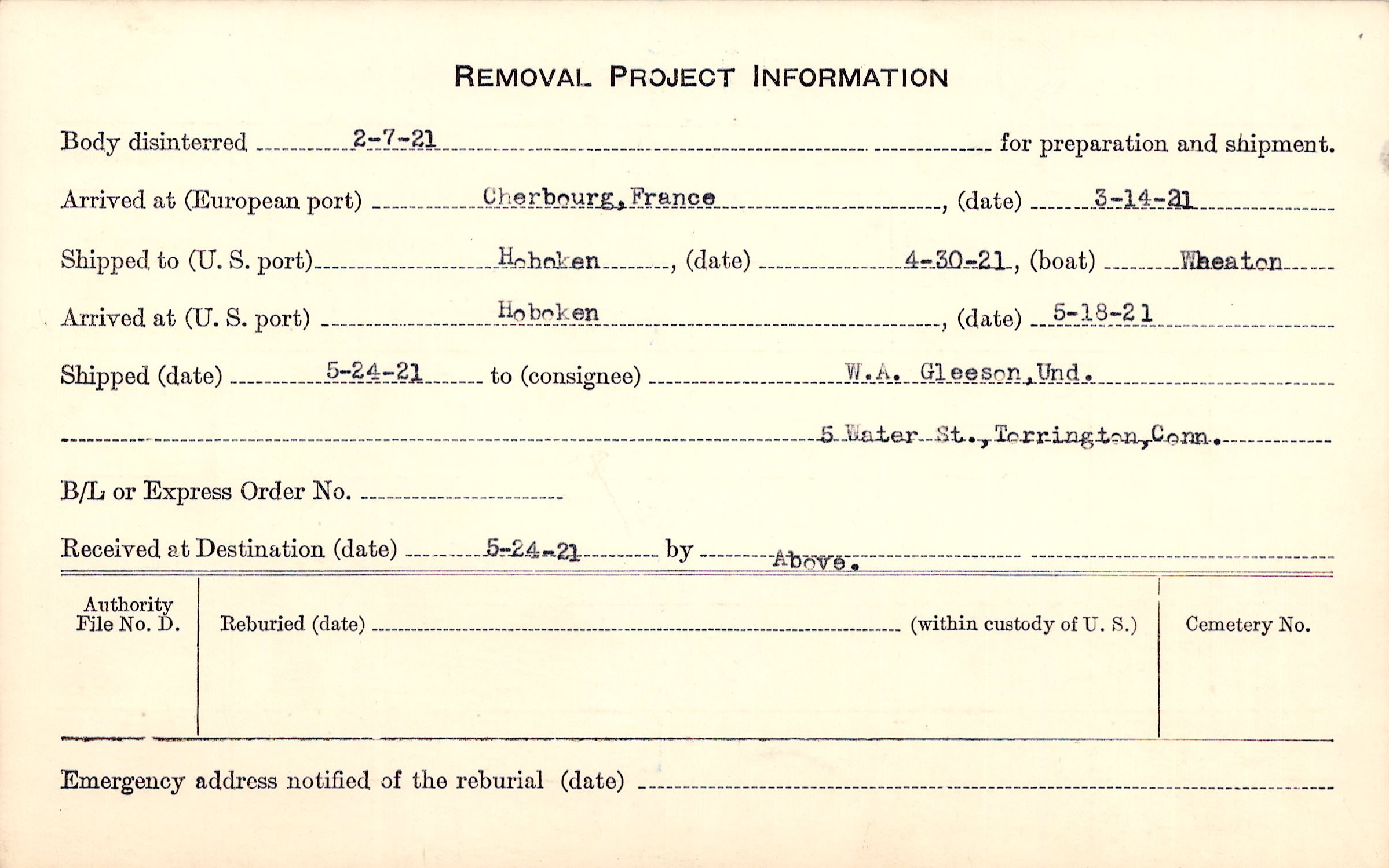 Body disinterred 2/7/1921 for preparation and shipment.