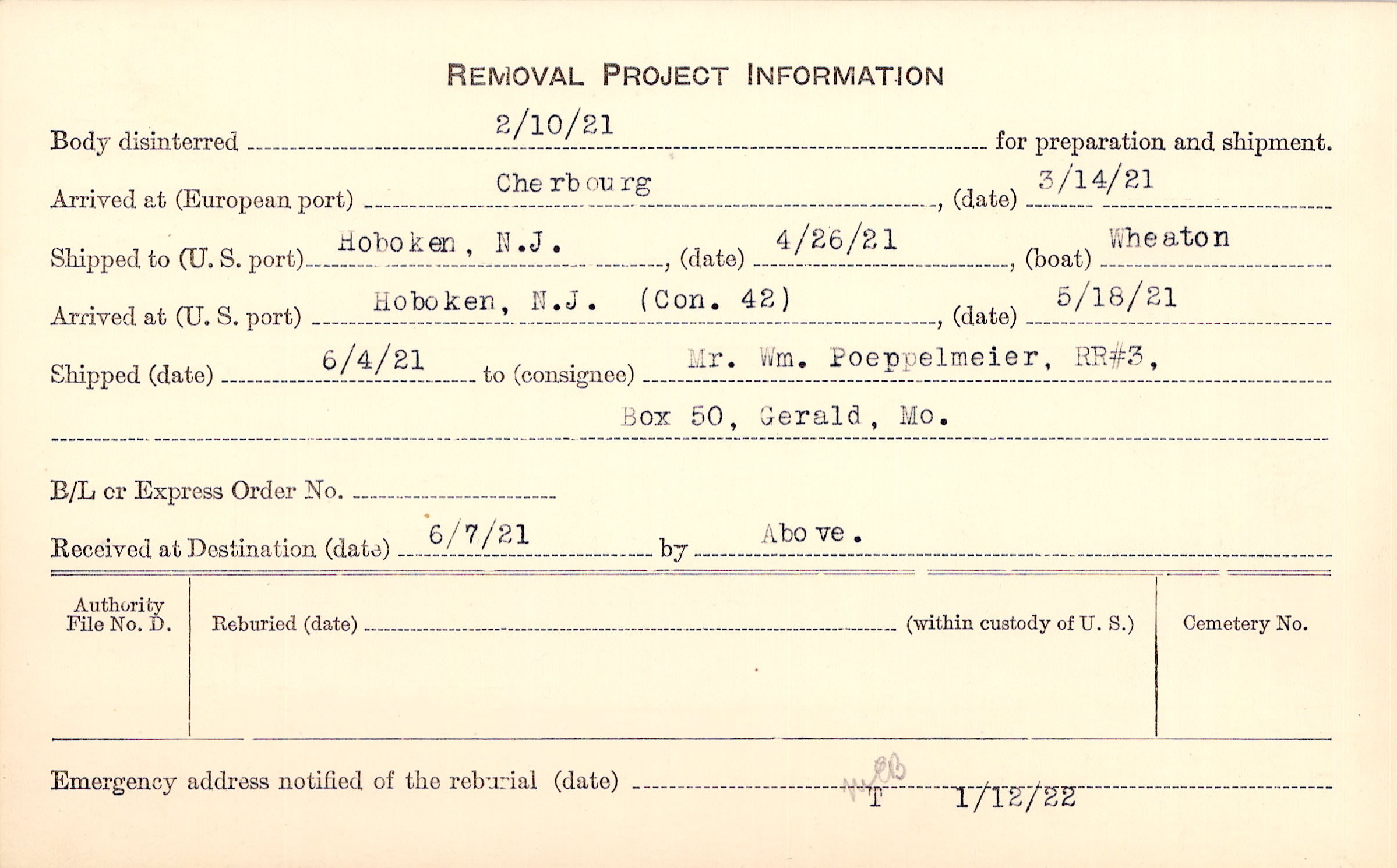 Body disinterred 2/10/1921 for preparation and shipment.