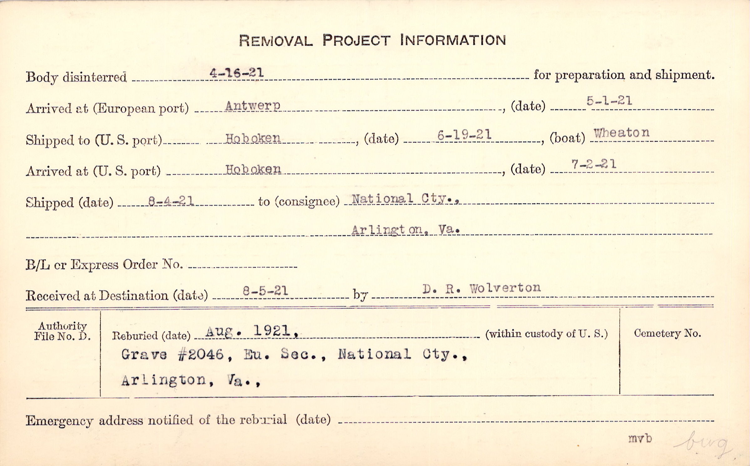 Body disinterred 4/16/1921 for preparation and shipment.