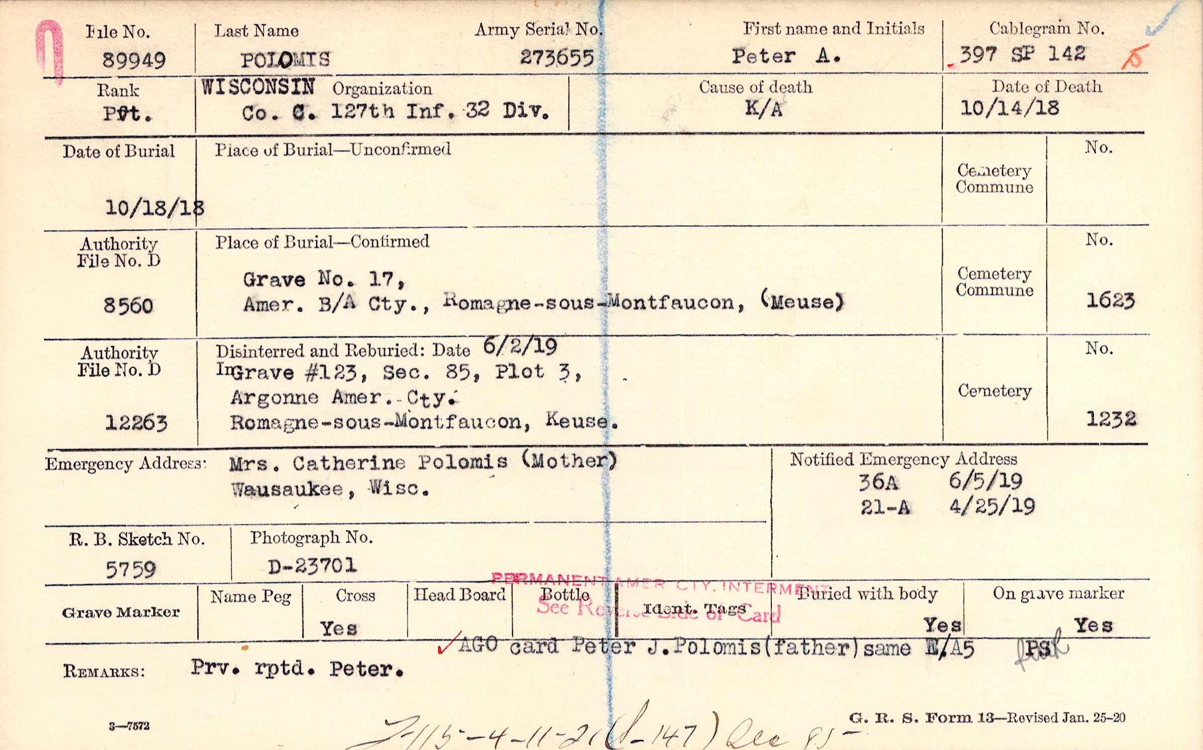 Grave 123, Section 85, Plot 3, Argonne American Cemetery, Romagne-sous-Montfaucon, Meuse