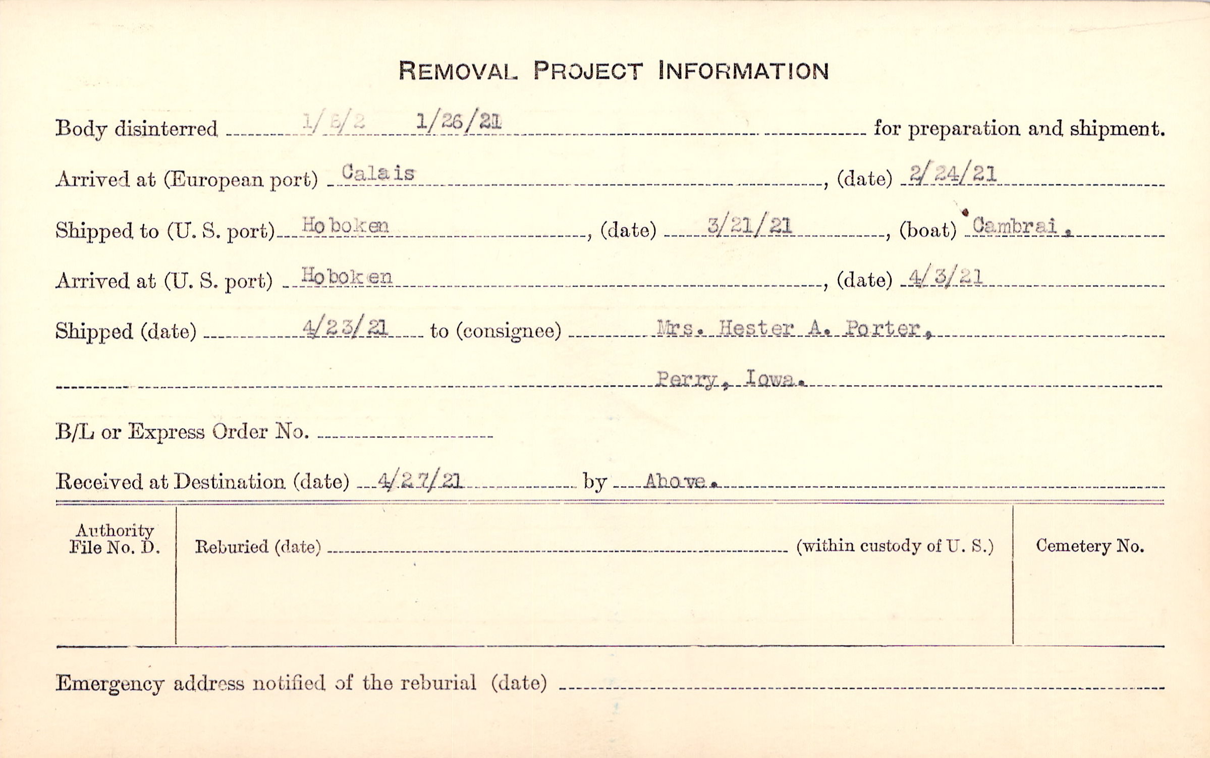 Beneficiary: Mrs. Hester A. Porter, (mother), RD #4, Bone, Iowa