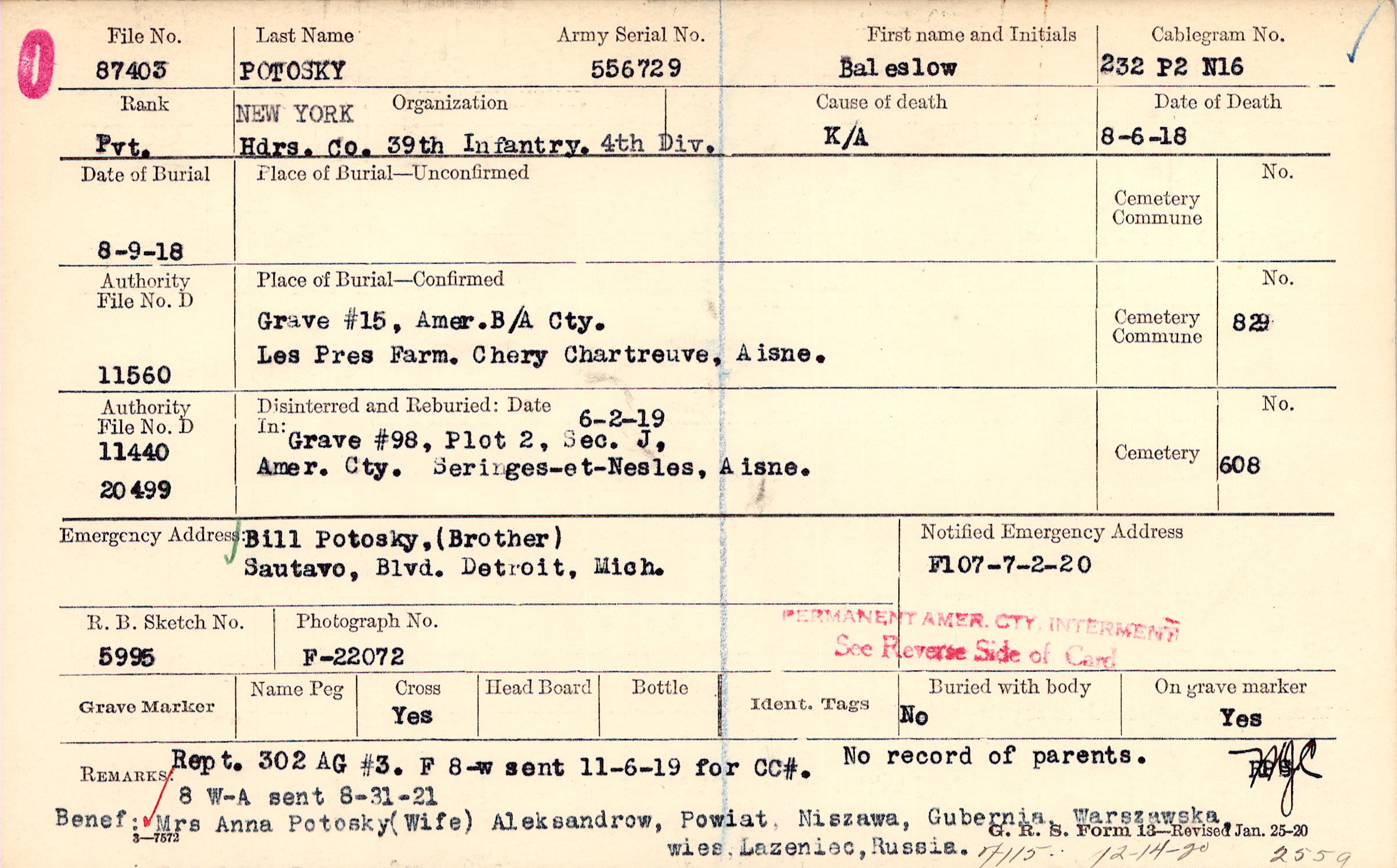 Rept. 302 AG #3 No record of parents Benef: Mrs. Anna Potosky (Wife) Aleksandrow, Powiat, Niszawa, Gubernia Warszawska, wies. Lazeniec, Russia, Rept. 302 AG #3. F 8-W sent 11-6-19 FOR CC#. 8 W-A sent 8-31-21, F115 12-14-20 2559