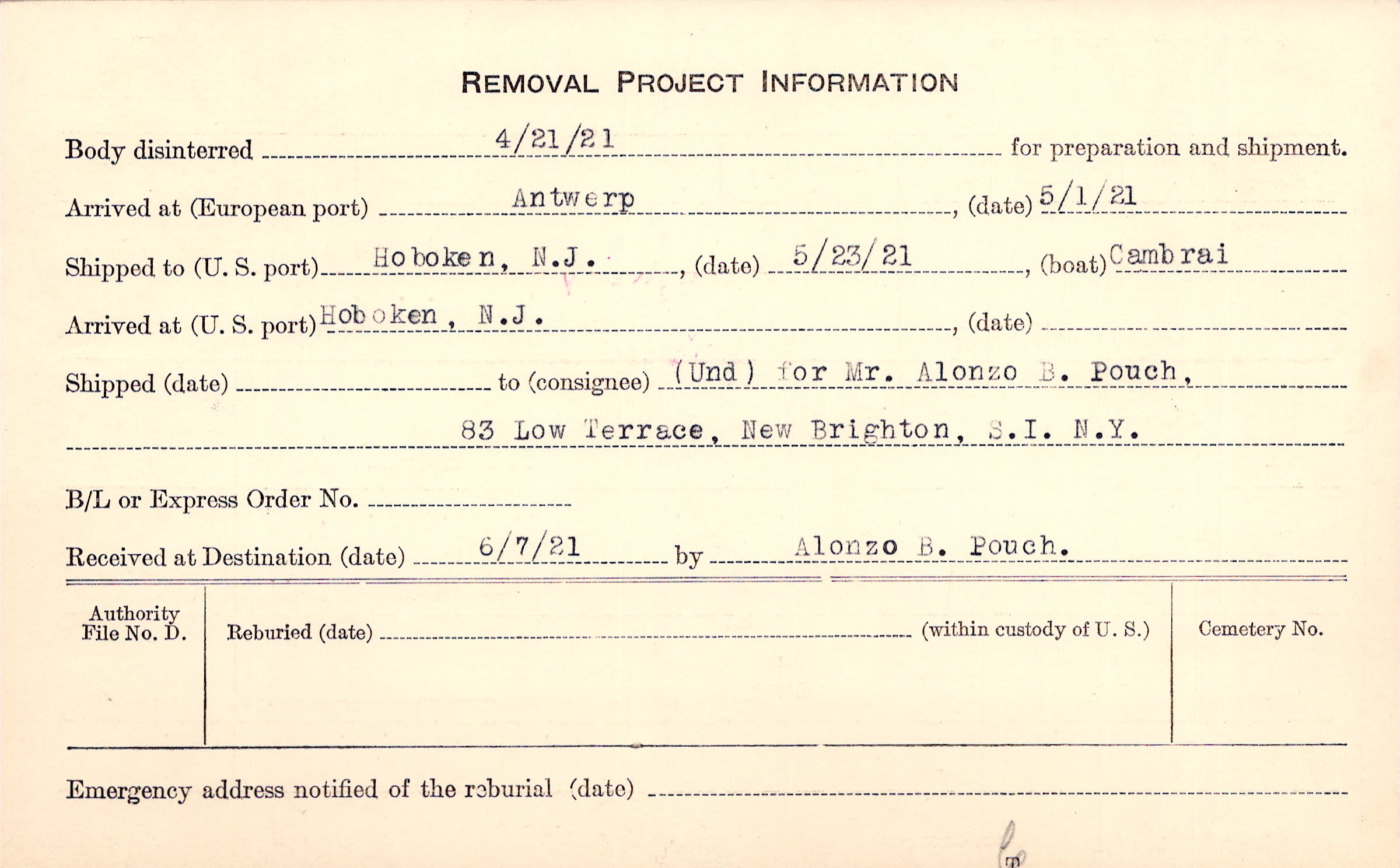 Body disinterred 4/21/1921 for preparation and shipment.