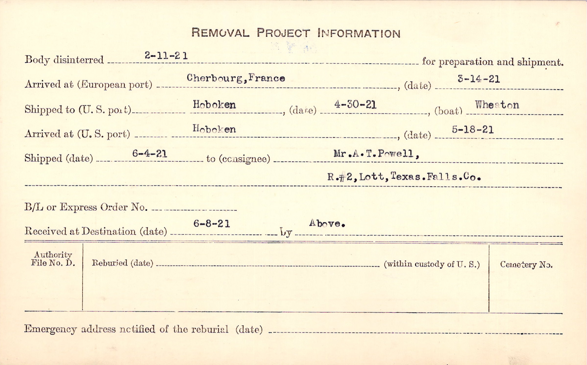 Body disinterred 2/11/1921 for preparation and shipment.