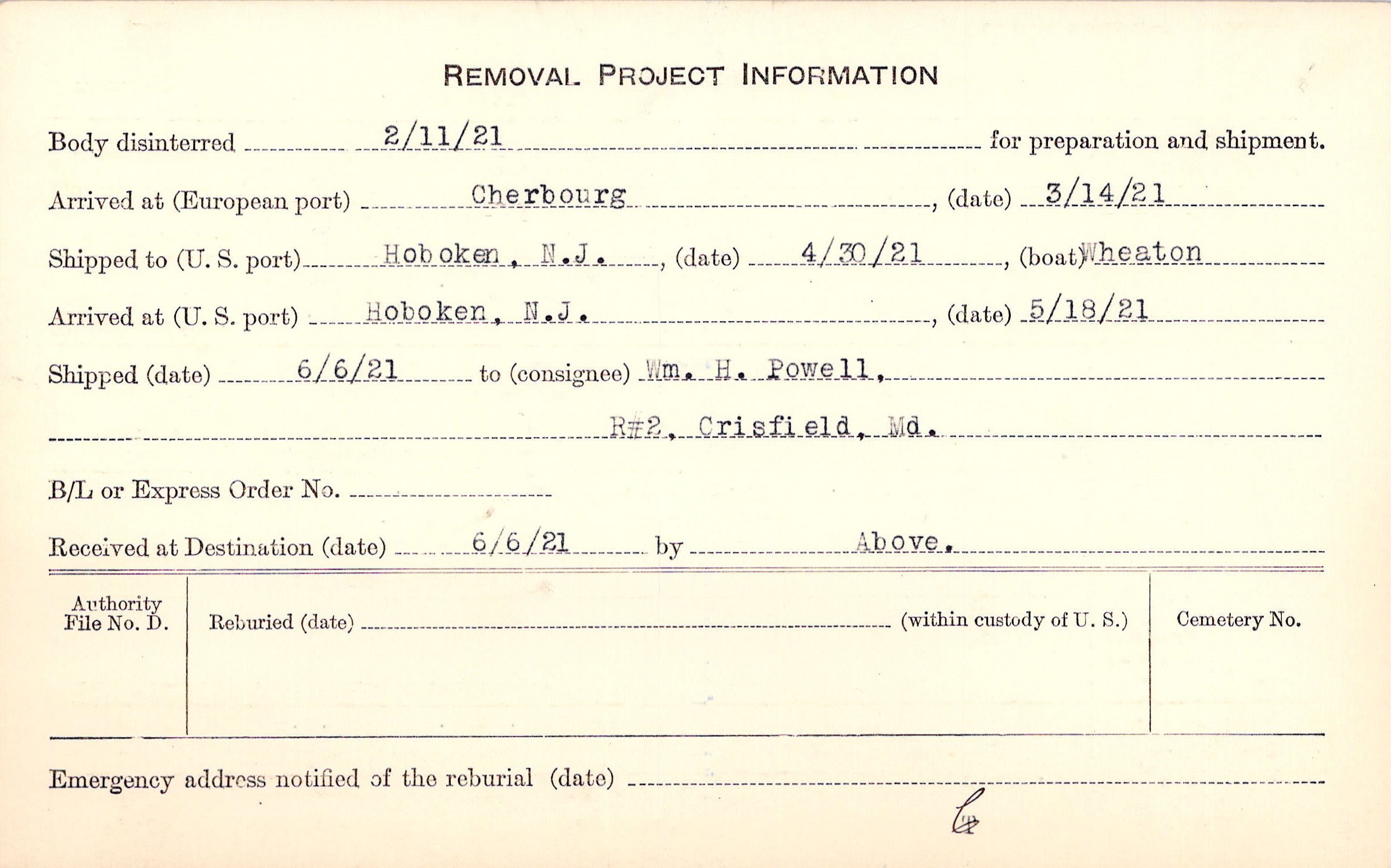 Body disinterred 2/11/1921 for preparation and shipment.