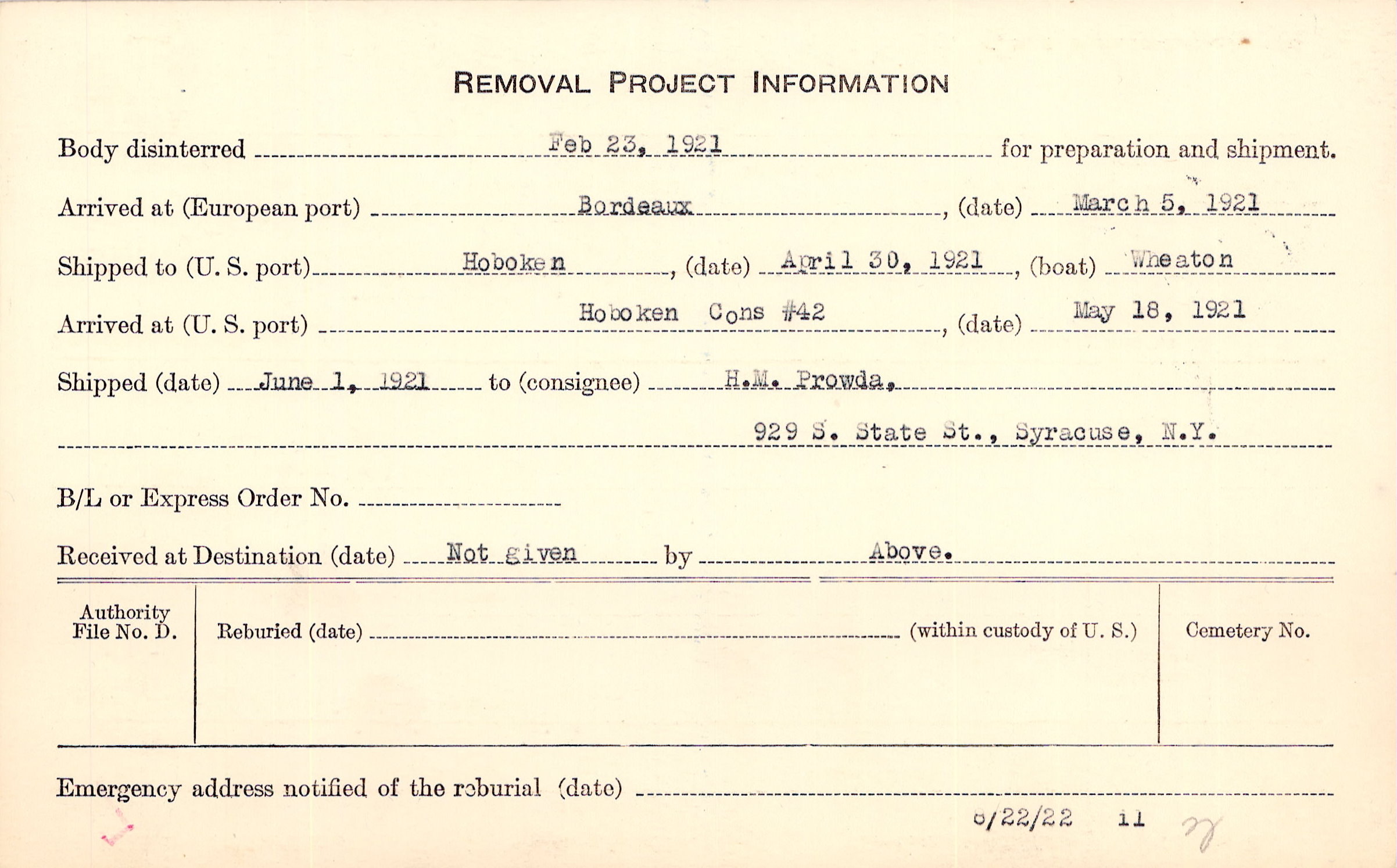 Mrs. Sarah Prowda, (Mother), 929 So. State St., Syracuse, N.Y.