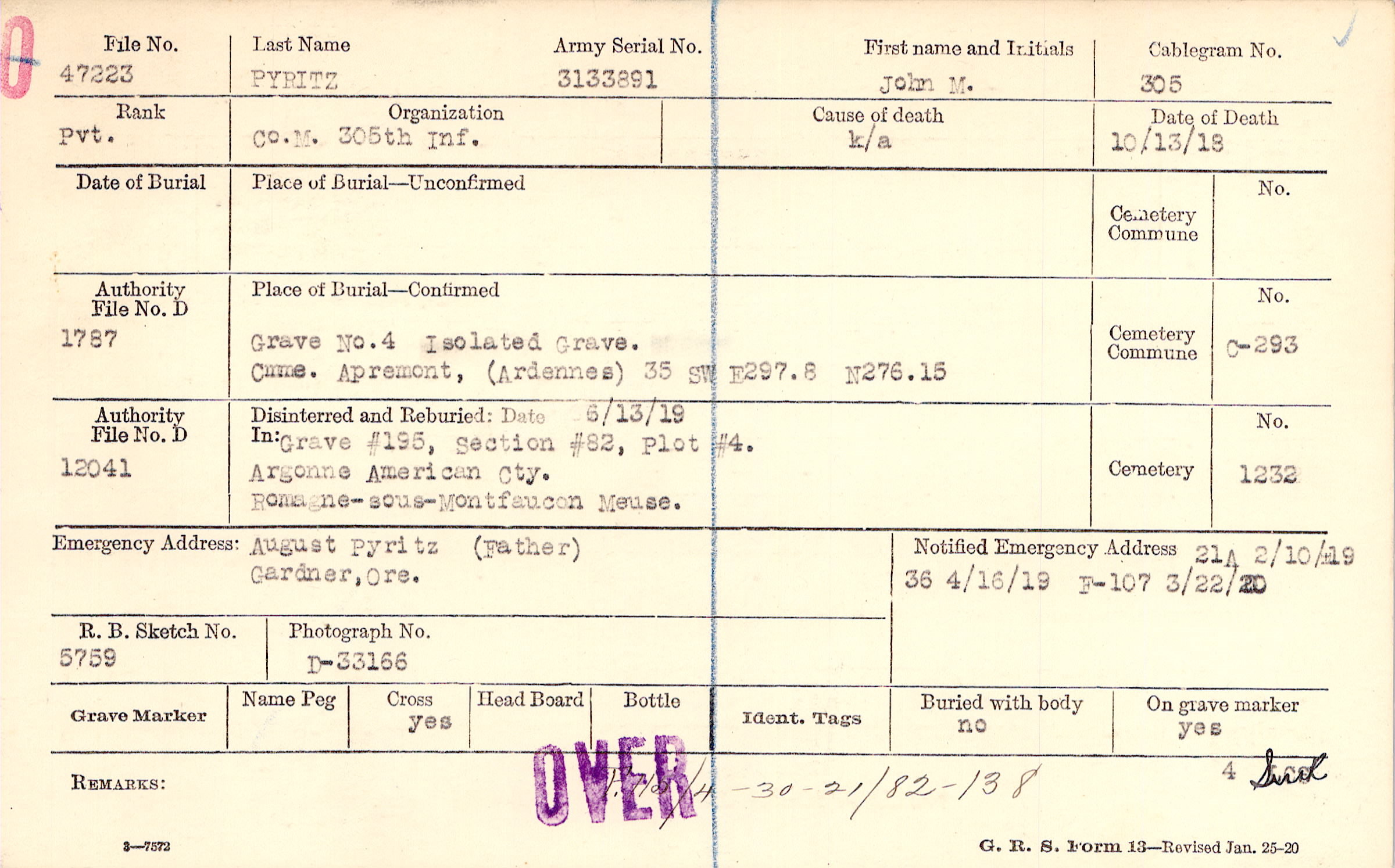 Grave 195, Section 82, Plot 4, Argonne American Cemetery, Romagne-sous-Montfaucon, Meuse