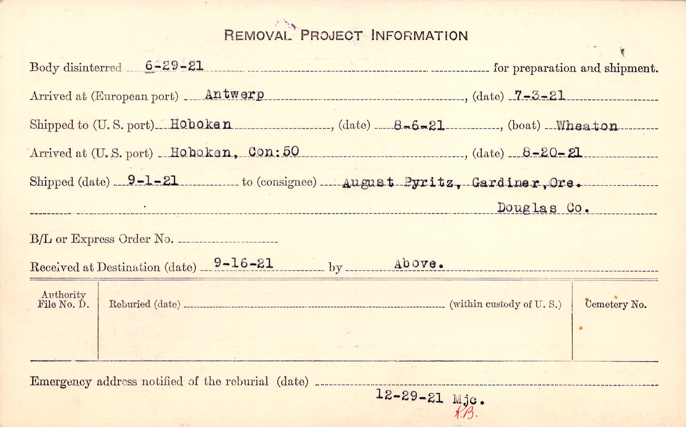 to August Pyritz, Gardiner, Ore. Douglas Co.